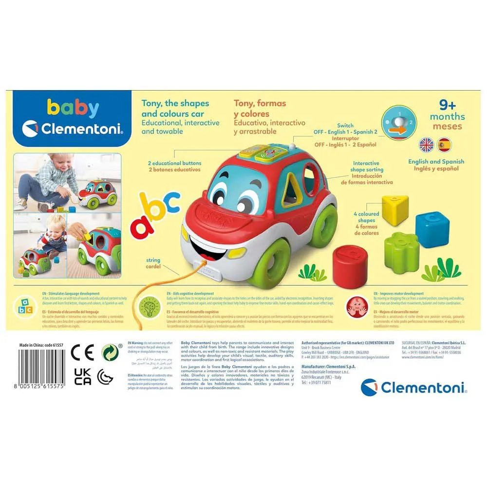 Машинка CLEMENTONI Tony Shapes And - идеальный подарок для поддержки когнитивного и физического развития вашего ребенка в увлекательной и стимулирующей форме. Это надежный, безопасный и долговечный компаньон для детей младшего возраста, созданный для того, чтобы расти вместе с вашим малышом, пока он исследует окружающий мир.