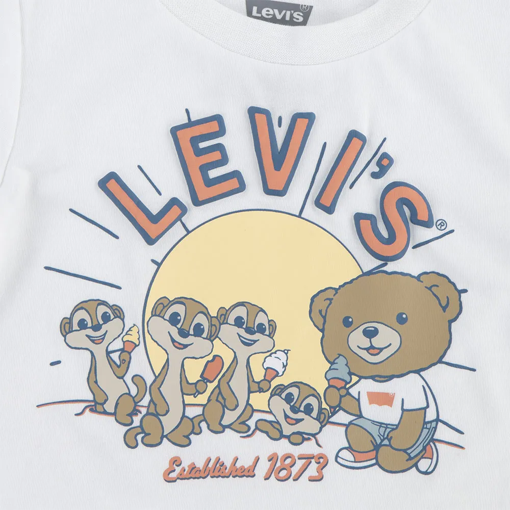 Этот комплект идеально подходит для теплой погоды благодаря коротким рукавам и шортам. Дышащая ткань помогает детям оставаться в прохладе и комфорте даже в самые жаркие дни. Прочная конструкция гарантирует, что комплект выдержит все приключения вашего ребенка, от игр с красками до прогулок на свежем воздухе. Детский джинсовый комплект LEVI´S Levi and Friends - это незаменимая вещь для любого родителя, ищущего универсальный, стильный и прочный наряд для своего ребенка.