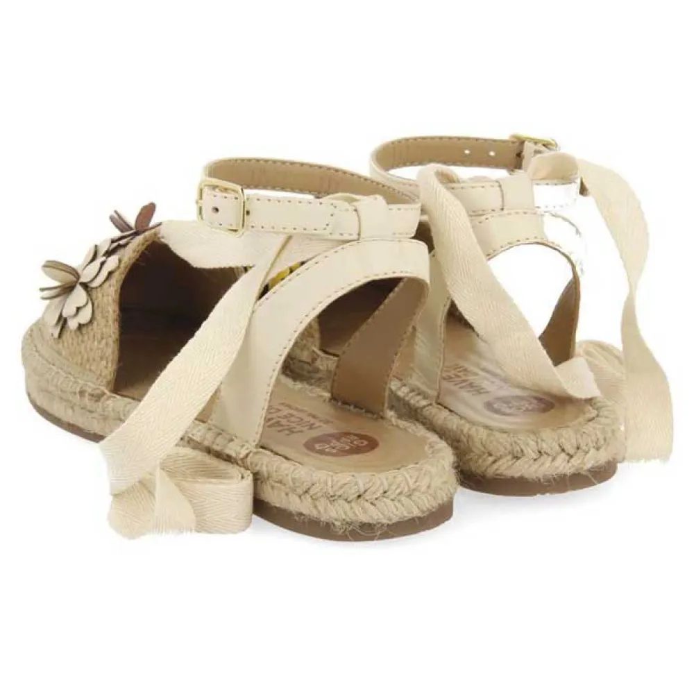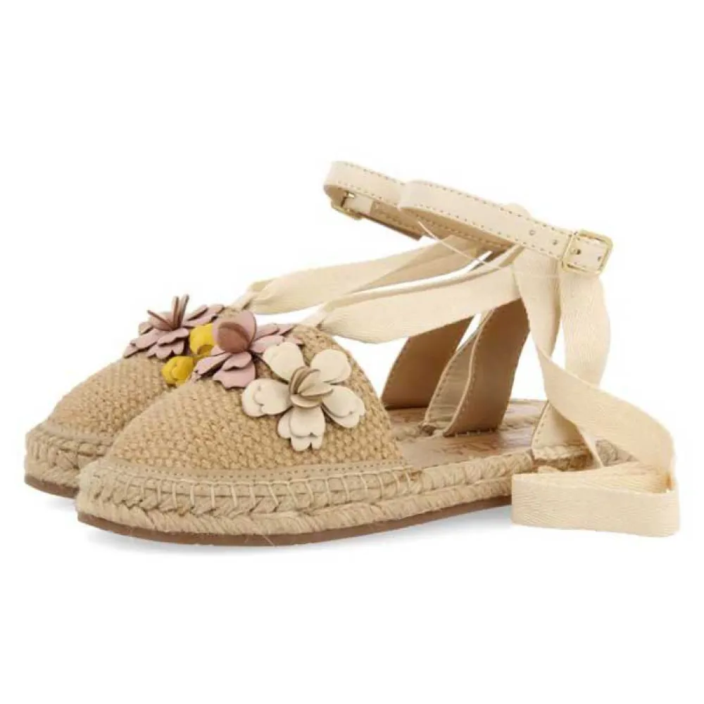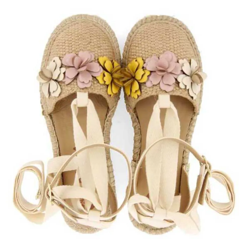 Один из самых ярких дизайнов сезона. Кожаные эспадрильи телесного цвета с разноцветным цветочным декором. Они имеют регулируемую застежку-пряжку и завязки на щиколотке, которые можно снимать или надевать. Без сомнения, это обязательный элемент гардероба!