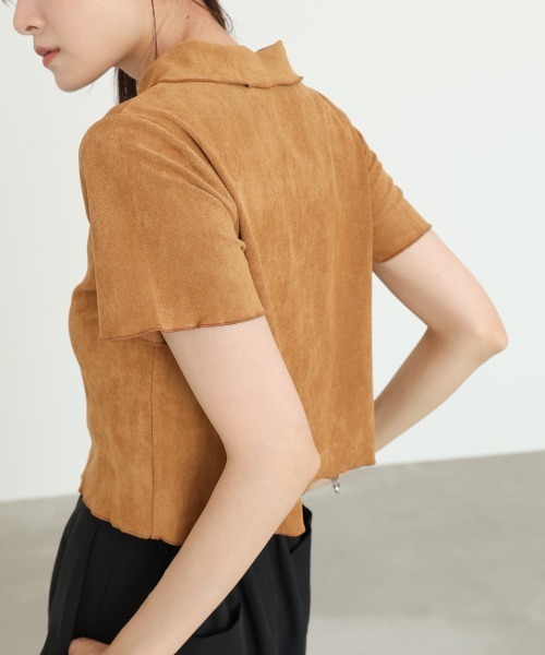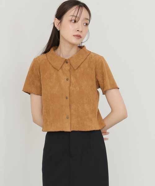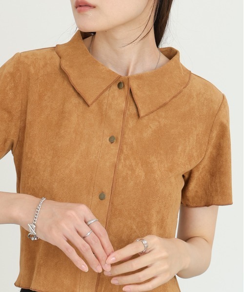 Эта блузка изготовлена из легкой замши и имеет гладкую текстуру.