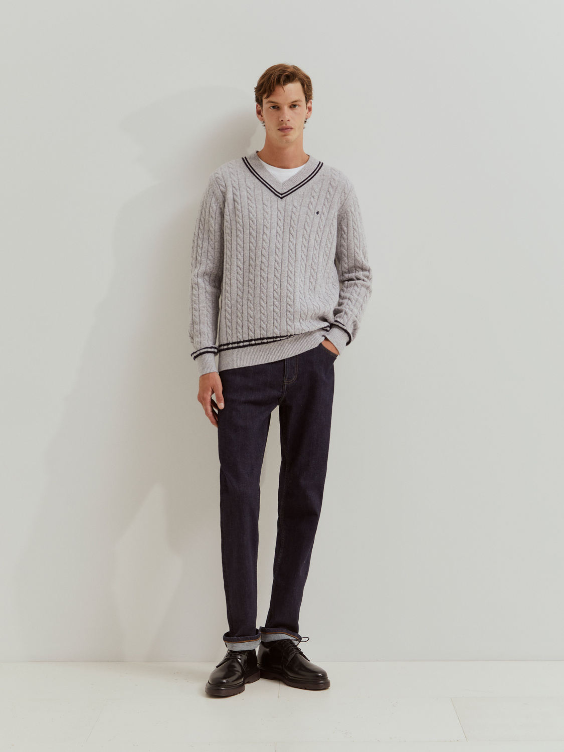 Пуловер с длинным рукавом из тканого трикотажа, идеально подходящий для добавления стиля и комфорта в мужской гардероб. Контрастный вышитый логотип со львом на груди и контрастные полоски по вырезу горловины, подолу и манжетам придают изделию индивидуальность. V-образный вырез позволяет легко носить его отдельно или поверх рубашек и футболок, что делает его универсальным для повседневных или более изысканных образов.