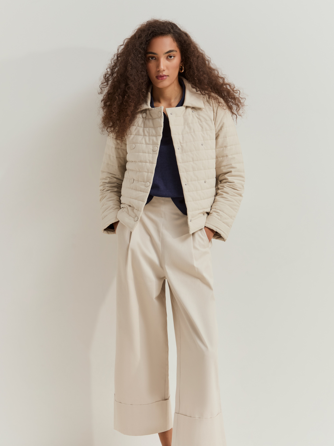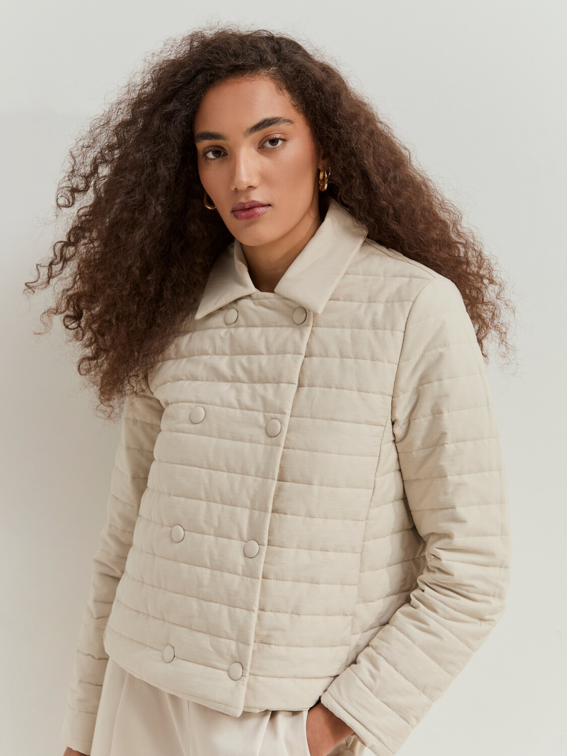 Куртка с горизонтальной стежкой, предназначенное для комфорта и защиты в холодные дни. Имеет застежку спереди на кнопки, закрытые той же тканью, что обеспечивает аккуратный и элегантный вид. Внутри — контрастная двухцветная окантовка, добавляющая современную и эксклюзивную деталь изделию.