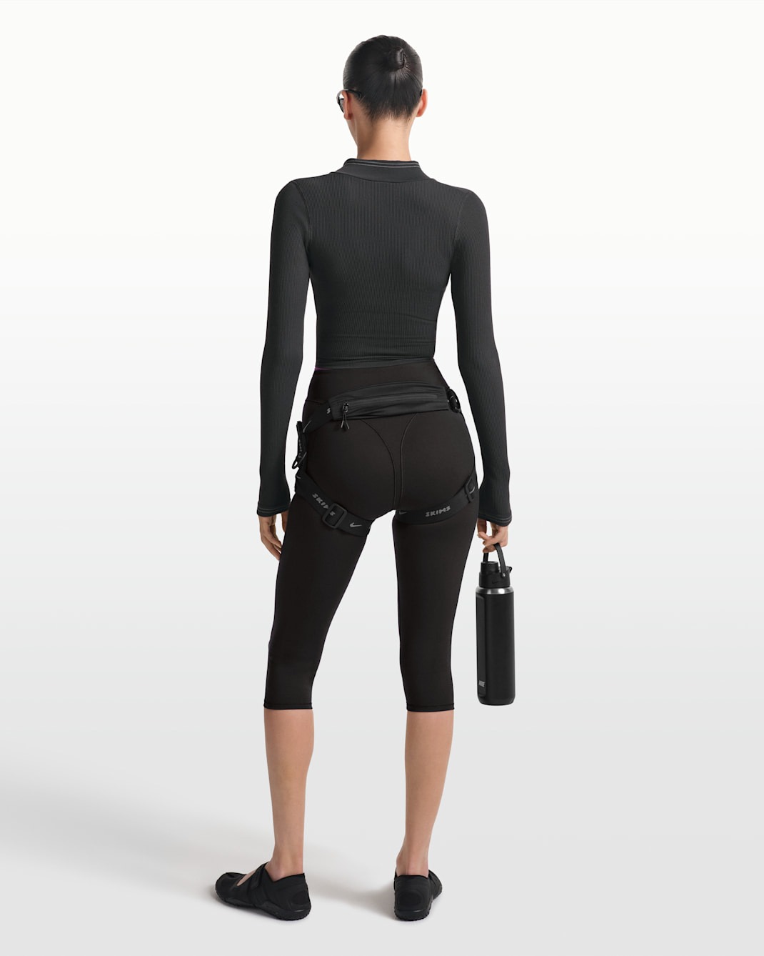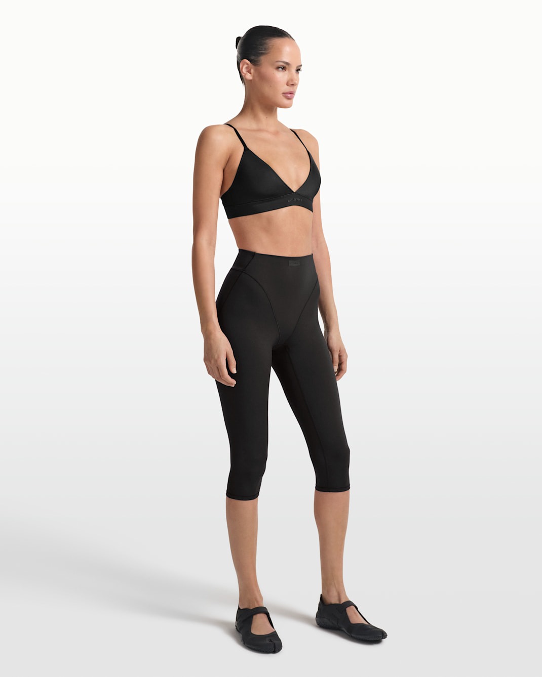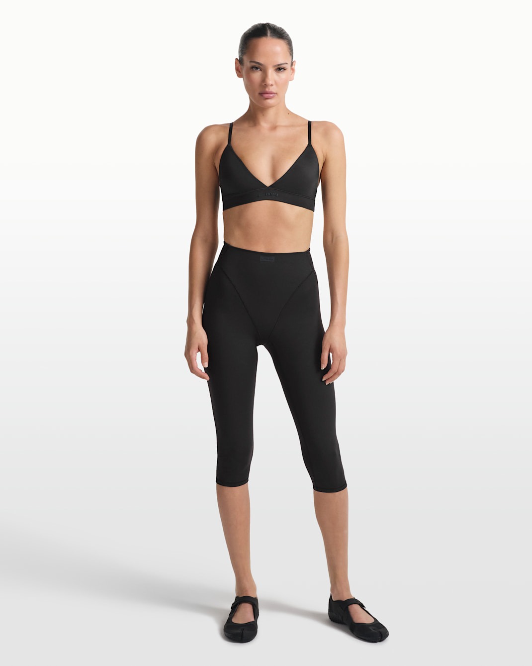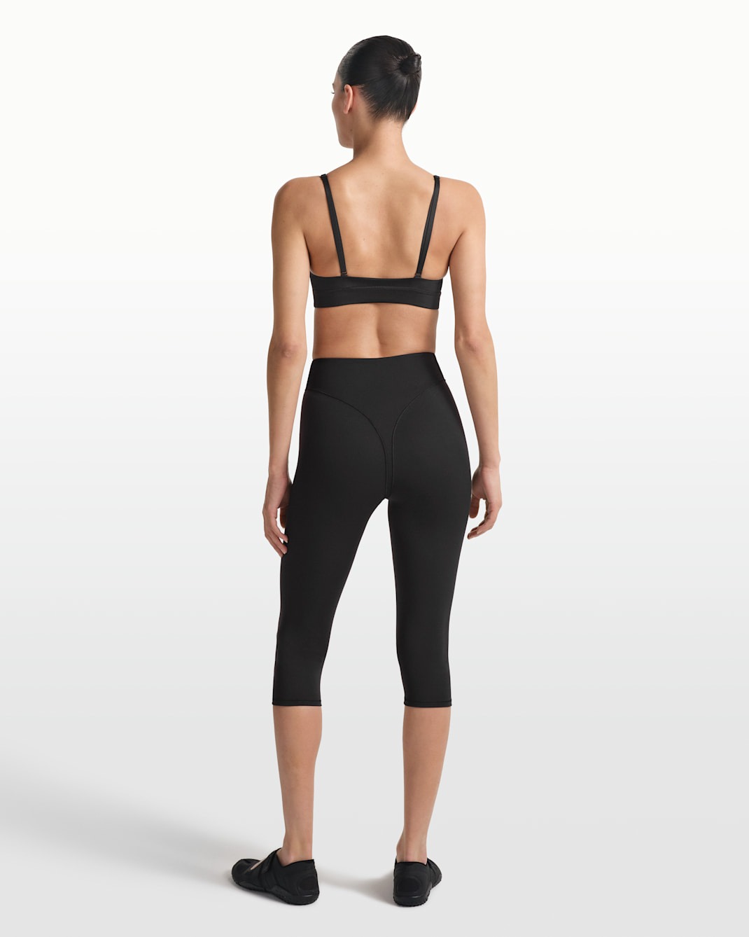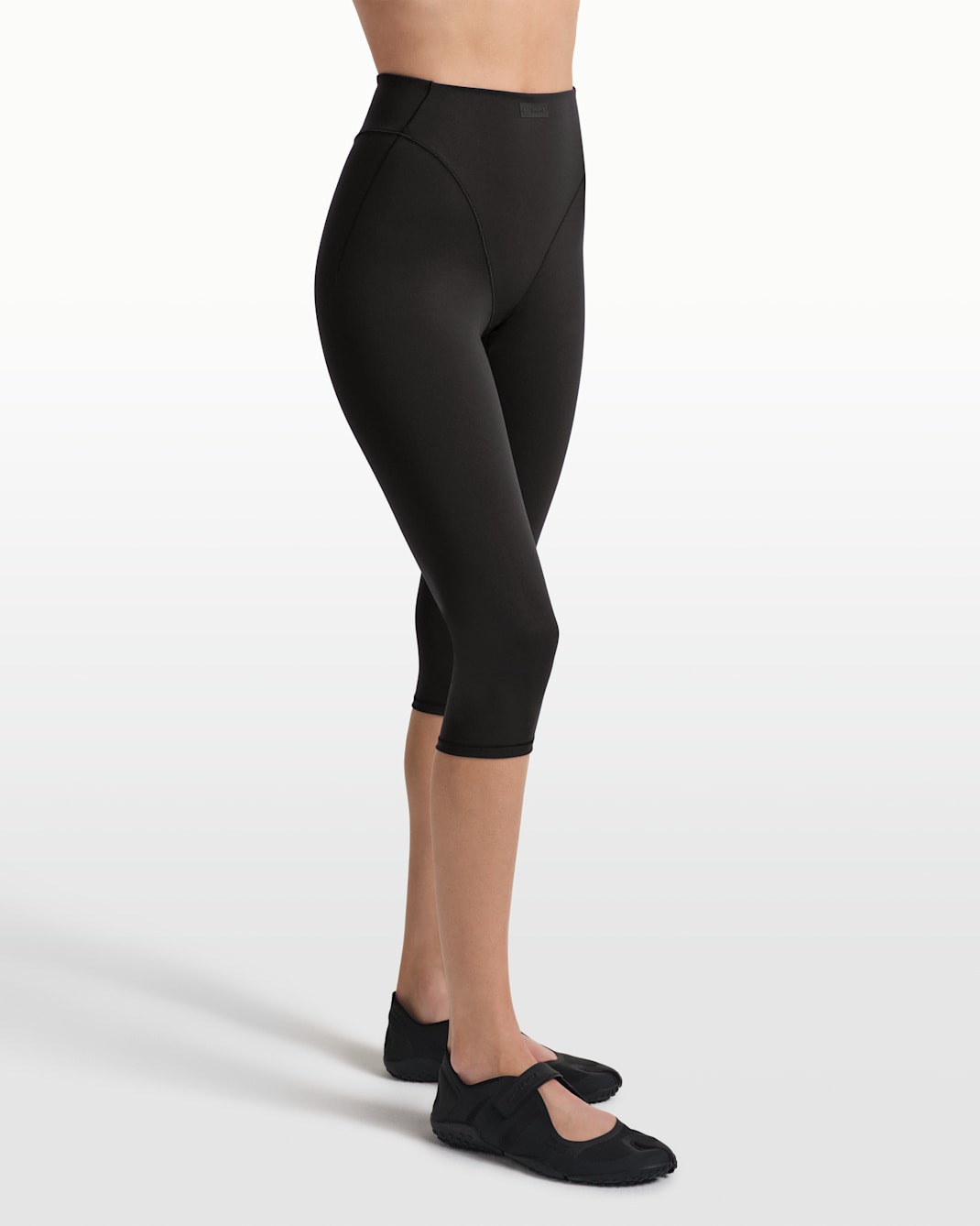Минималистичный и архитектурный. V-образная вставка на талии добавляет модели структурности и современного шика, делая даже базовые леггинсы выразительными. Укороченная длина капри (до середины икры) идеально подходит для тренировок в теплое время года и позволяет продемонстрировать обувь. Матовая текстура ткани выглядит премиально и дорого.