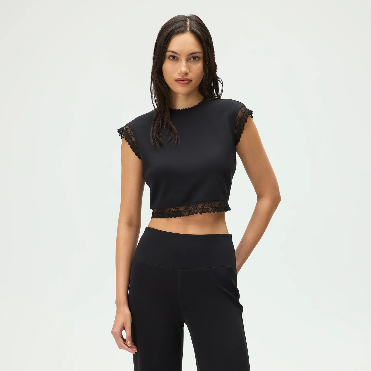 Топ Cara Cropped Tee из коллаборации Lisa для Kith Women — это мастерское сочетание повседневного комфорта и изысканных деталей. Выполненный из мягкой смеси полиэстера и вискозы, он дарит ощущение невесомости и уюта с первой секунды. Глубокий черный цвет становится идеальным фоном для кружевных акцентов, которые превращают простой топ в эффектный предмет гардероба.