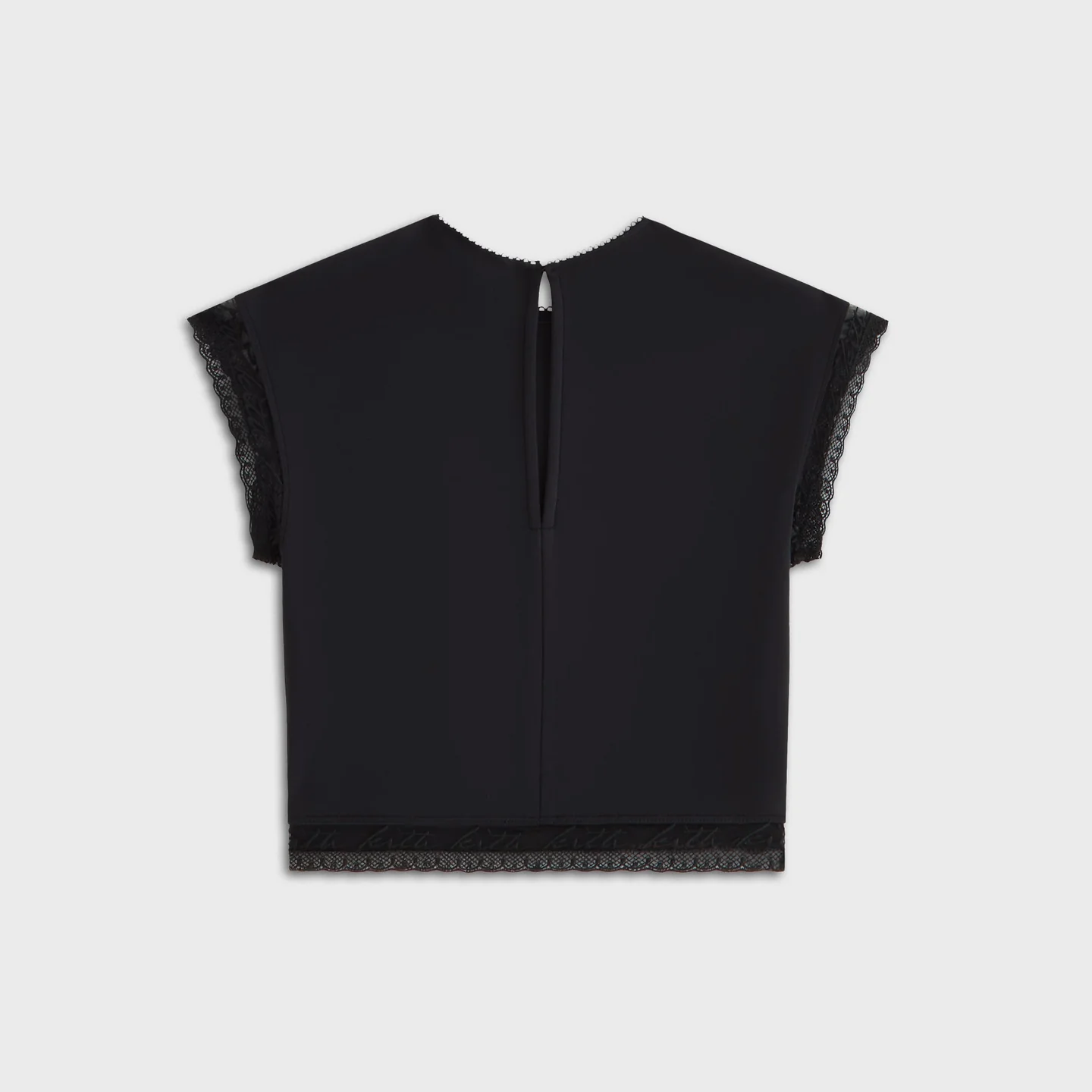 Открытый вырез (open neckline) элегантно обрамляет зону декольте, добавляя образу женственности. Главный секрет модели скрывается сзади — изящная петля с застежкой на пуговицу (keyhole with button closure at the back) открывает соблазнительный фрагмент спины, делая образ неожиданным и запоминающимся. Рукава и подол декорированы эксклюзивным кружевом Kith с фирменным узором (custom Kith-branded woven lace-trimmed sleeves and hem), которое добавляет нотку романтики и роскоши.