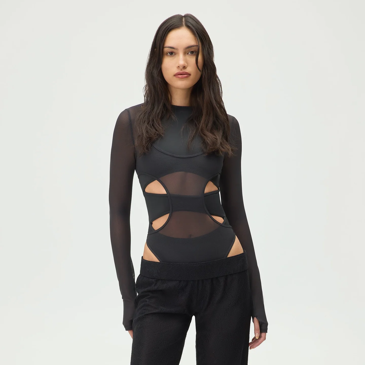 Главная особенность модели — комбинированные вставки по всей поверхности (all-over combo panels), которые создают иллюзию многослойности и делают боди визуально сложным и продуманным. Вырезы (cut out detailing) добавляют дерзости и открывают соблазнительные фрагменты тела, превращая базовый предмет в эффектный акцент любого образа.