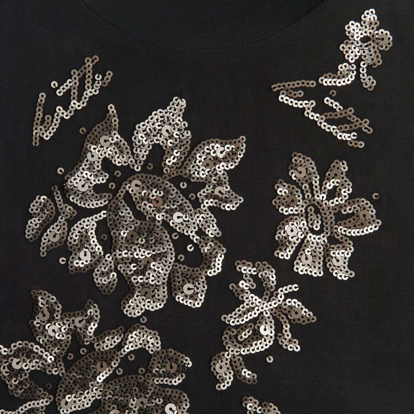 Главная особенность модели — изысканная отделка. Вся поверхность платья покрыта замысловатой инкрустацией (intricate all-over embellishments), которая создает эффект звездного неба и делает образ незабываемым. Высокая стойка (mock neckline) добавляет платью элегантности и создает элегантный контраст с открытой спиной.