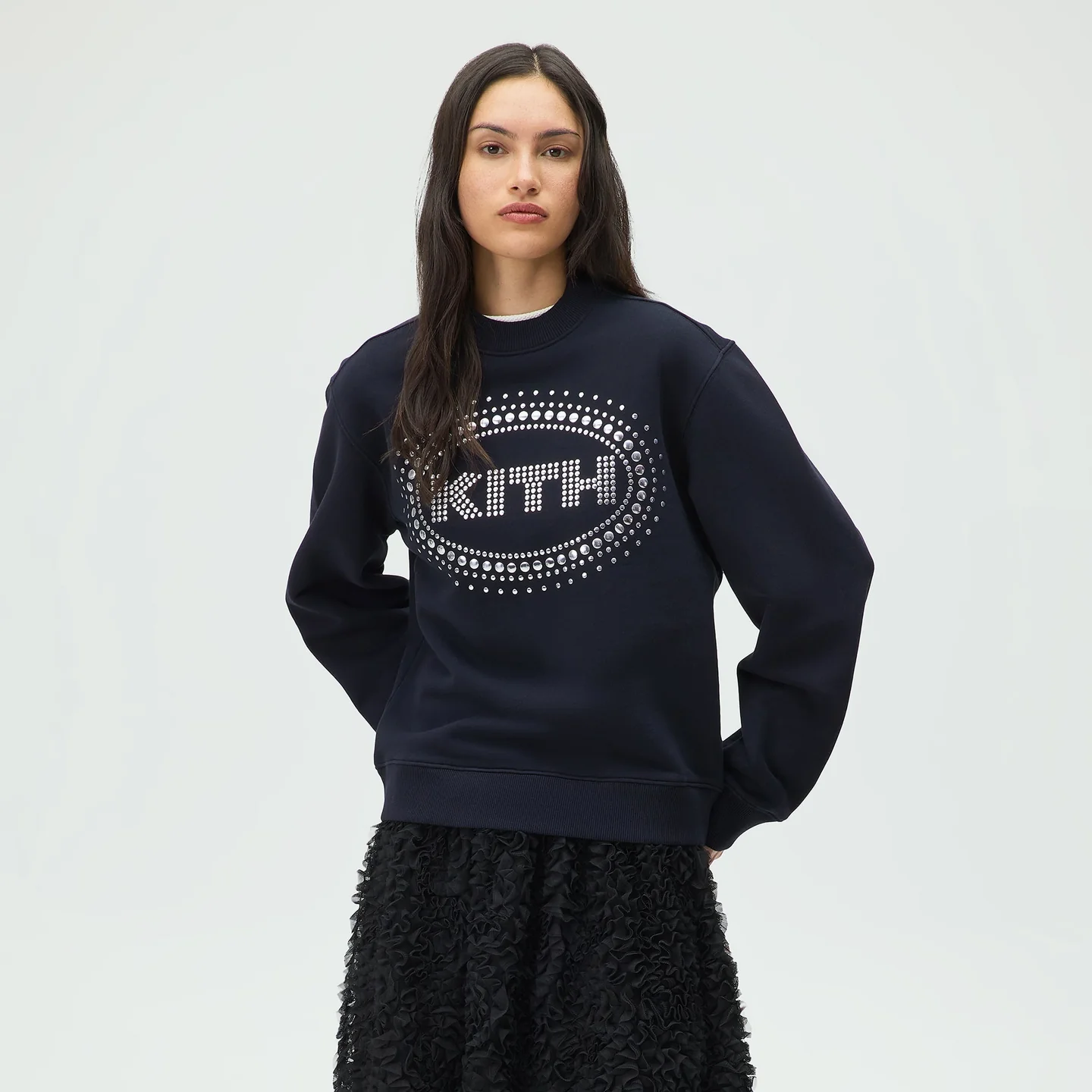 Ключевая особенность этого свитшота — изысканное украшение Kith на груди (Kith embellishment at the chest). Мерцающие детали добавляют образу праздничности и делают даже самый простой лук продуманным и эффектным. Это тот случай, когда одна вещь становится центром внимания.