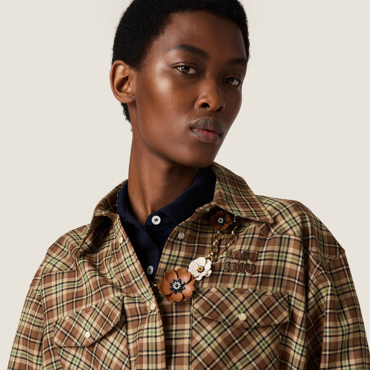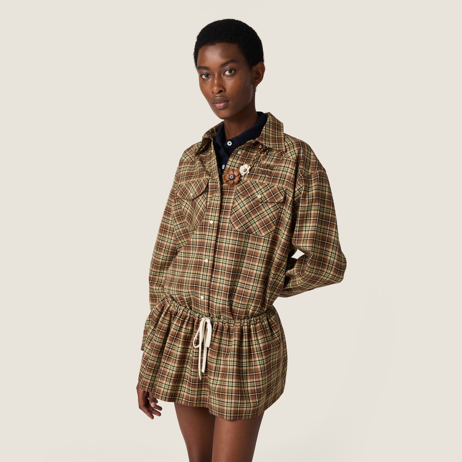 Эта рубашка отражает эксперименты Miu Miu с мужским стилем: клетчатый узор в винтажном настроении, свободный крой и вышитый тональный логотип с буквами определяют культовую, современную индивидуальность.