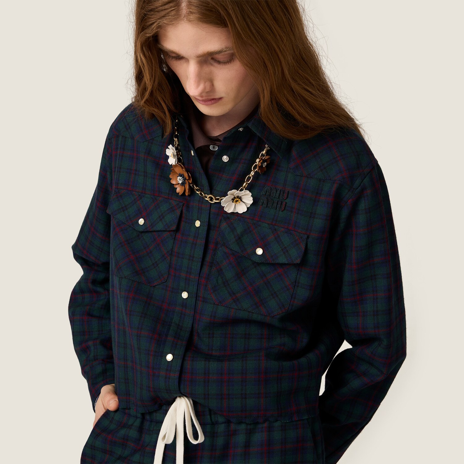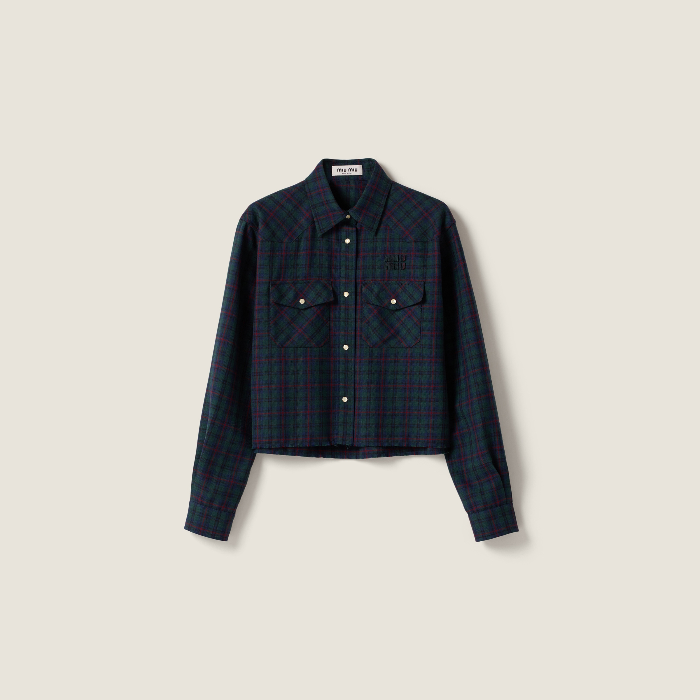 Эта рубашка отражает эксперименты Miu Miu с мужским стилем: клетчатый узор в винтажном стиле, свободный крой и вышитый однотонный логотип формируют культовую современную идентичность.