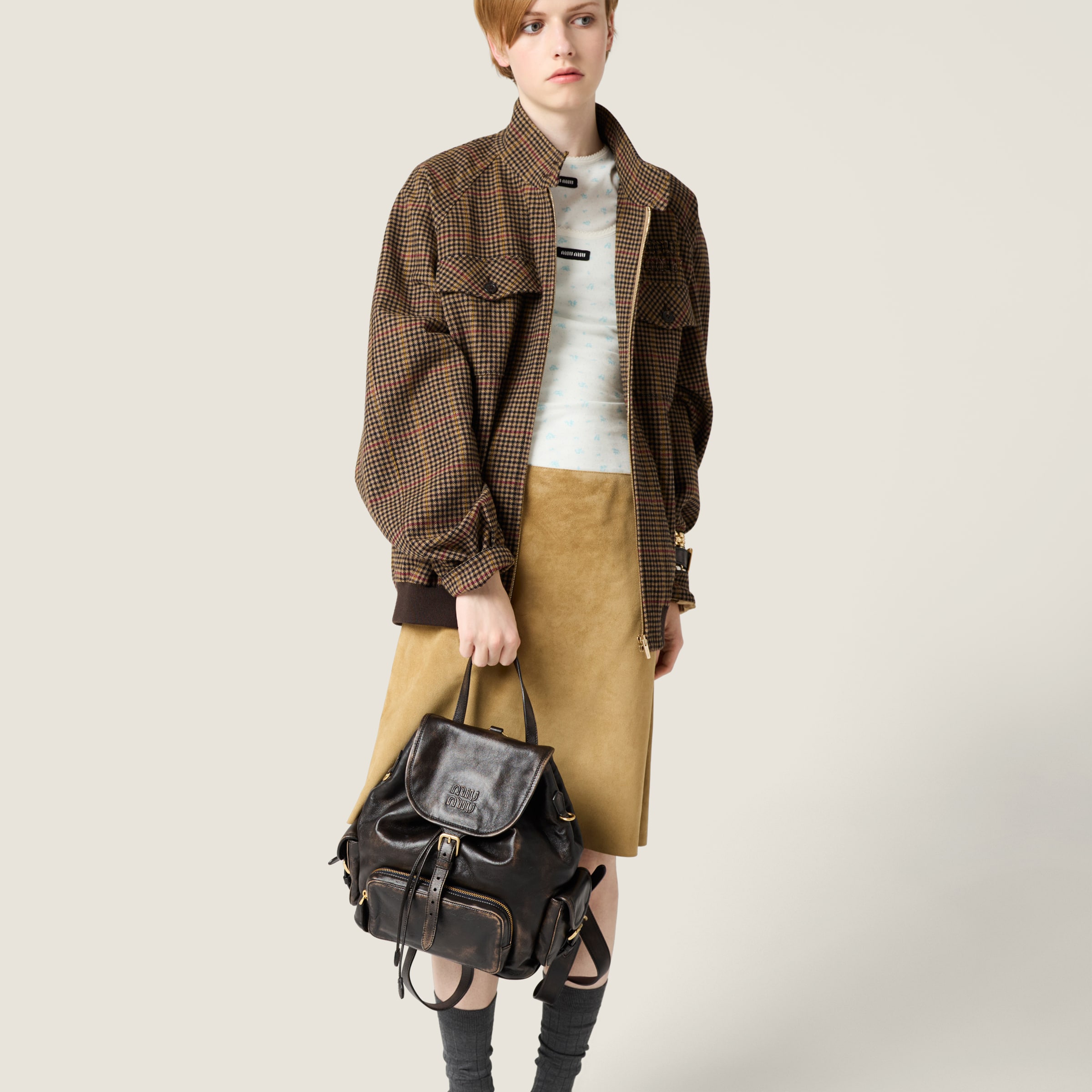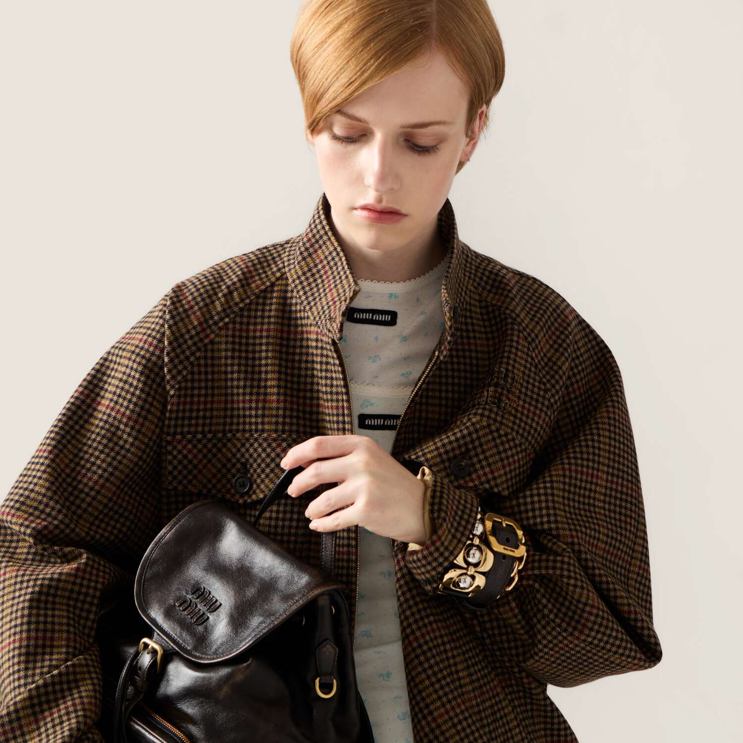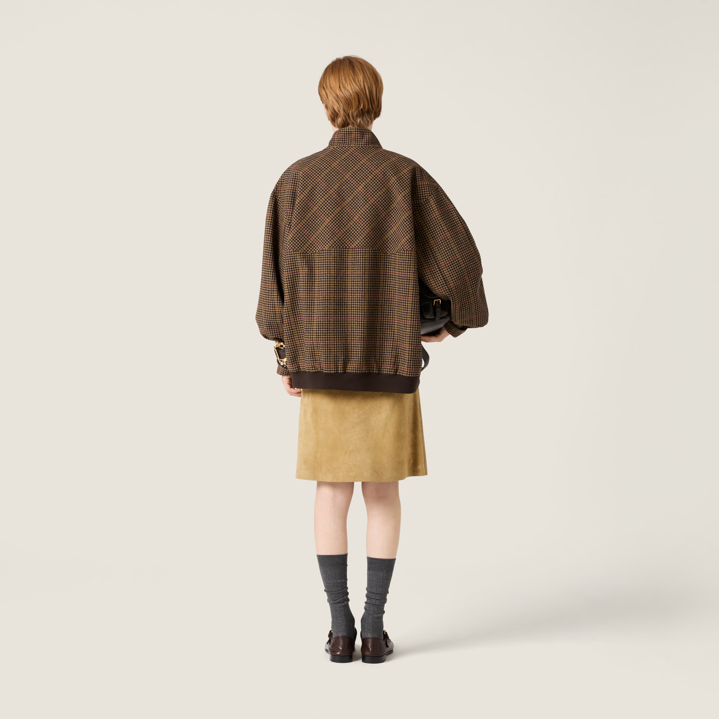Классическая клетка «гусиная лапка» сочетается с духом блузон-куртки в свободном мужском крое, украшенном вышитым логотипом, который подчеркивает культовый и вне времени характер.
