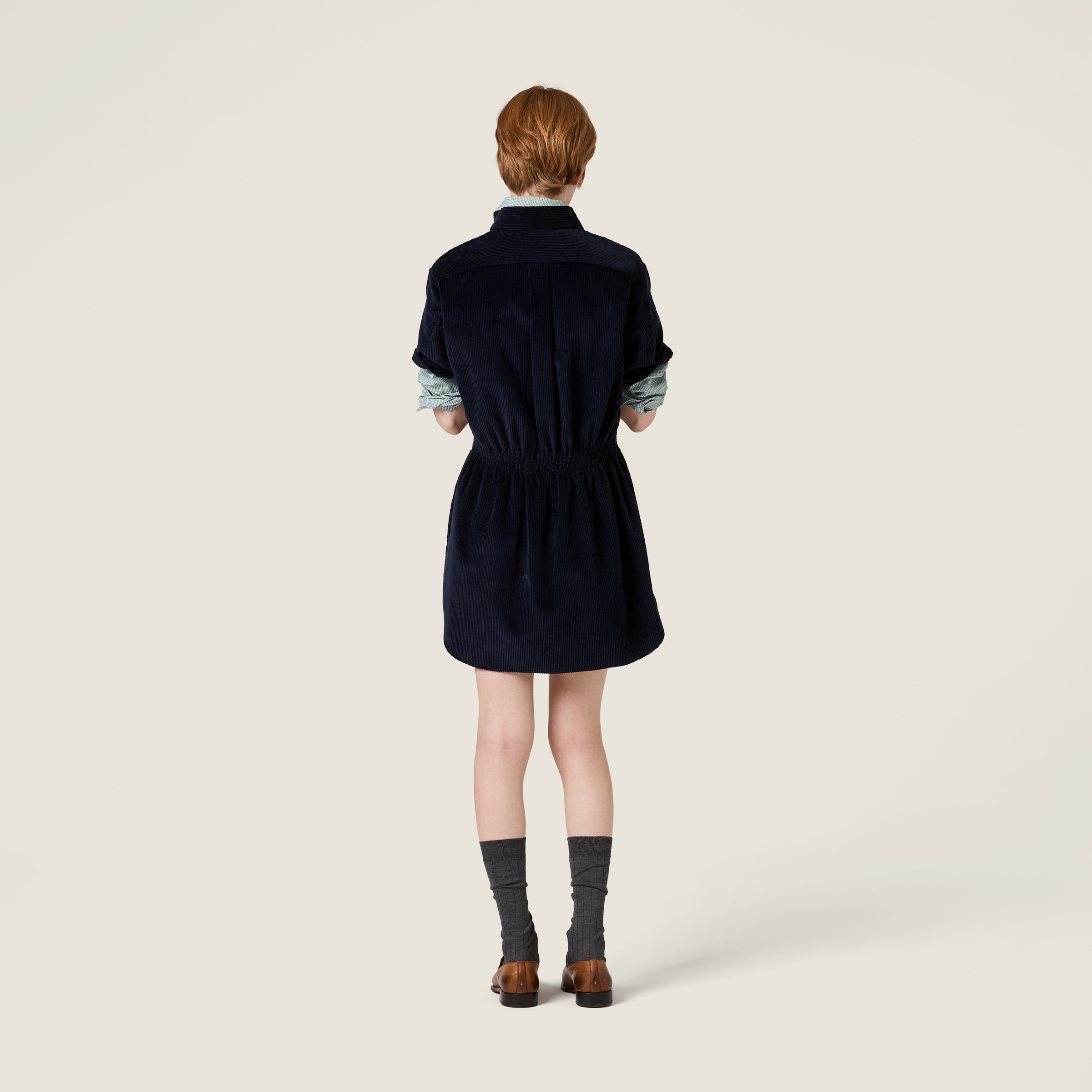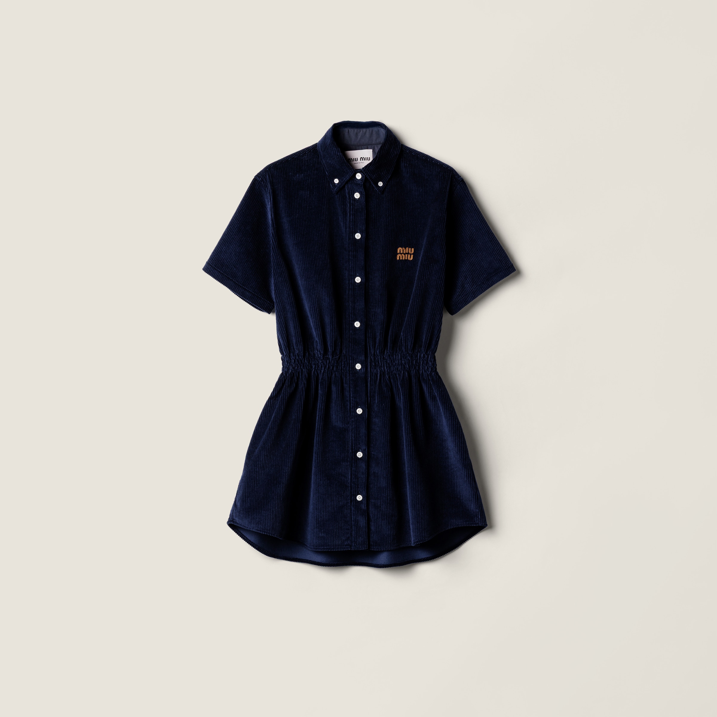 Это вельветовое платье, вдохновленное мужскими рубашками, переосмысливает эстетику 1990-х годов с женственным силуэтом и культовыми деталями, такими как пуговицы и контрастная кожаная эмблема.