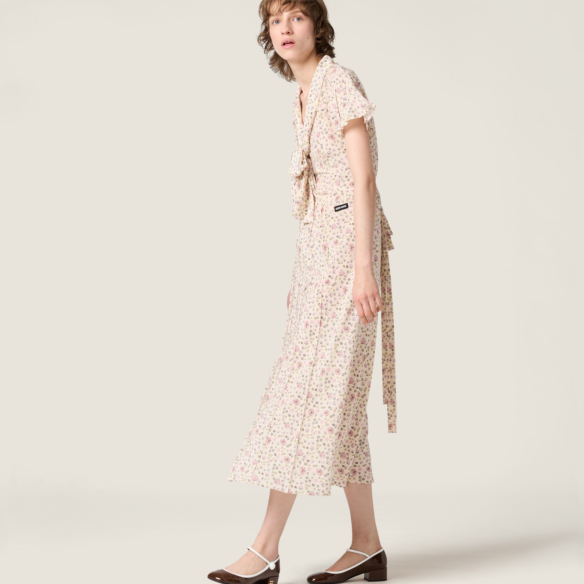 Цветочные принты, вдохновленные архивом Miu Miu, сочетаются с легким крепдешином, подчеркивая романтичный, женственный силуэт этого платья с мягкими объемами и выразительными деталями.