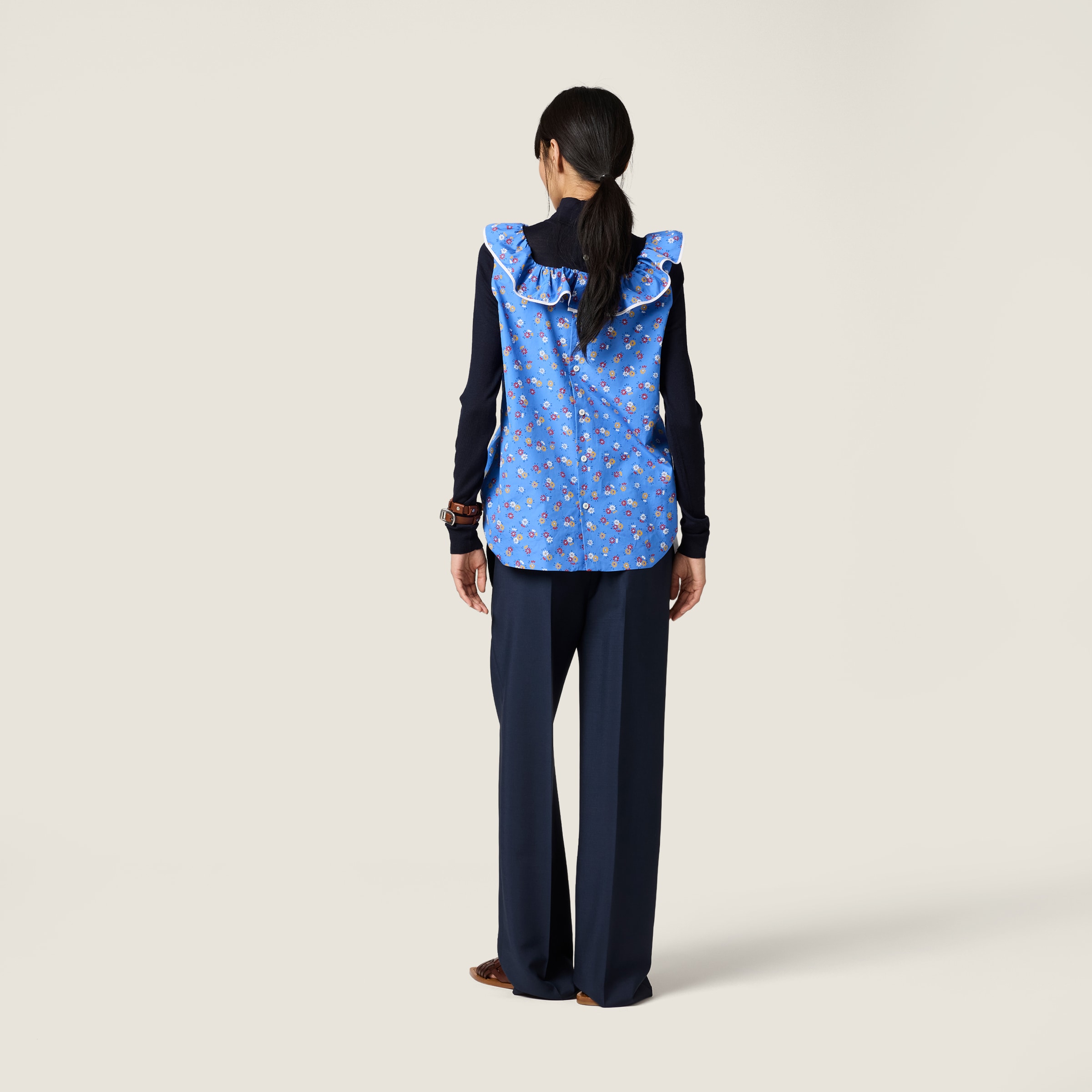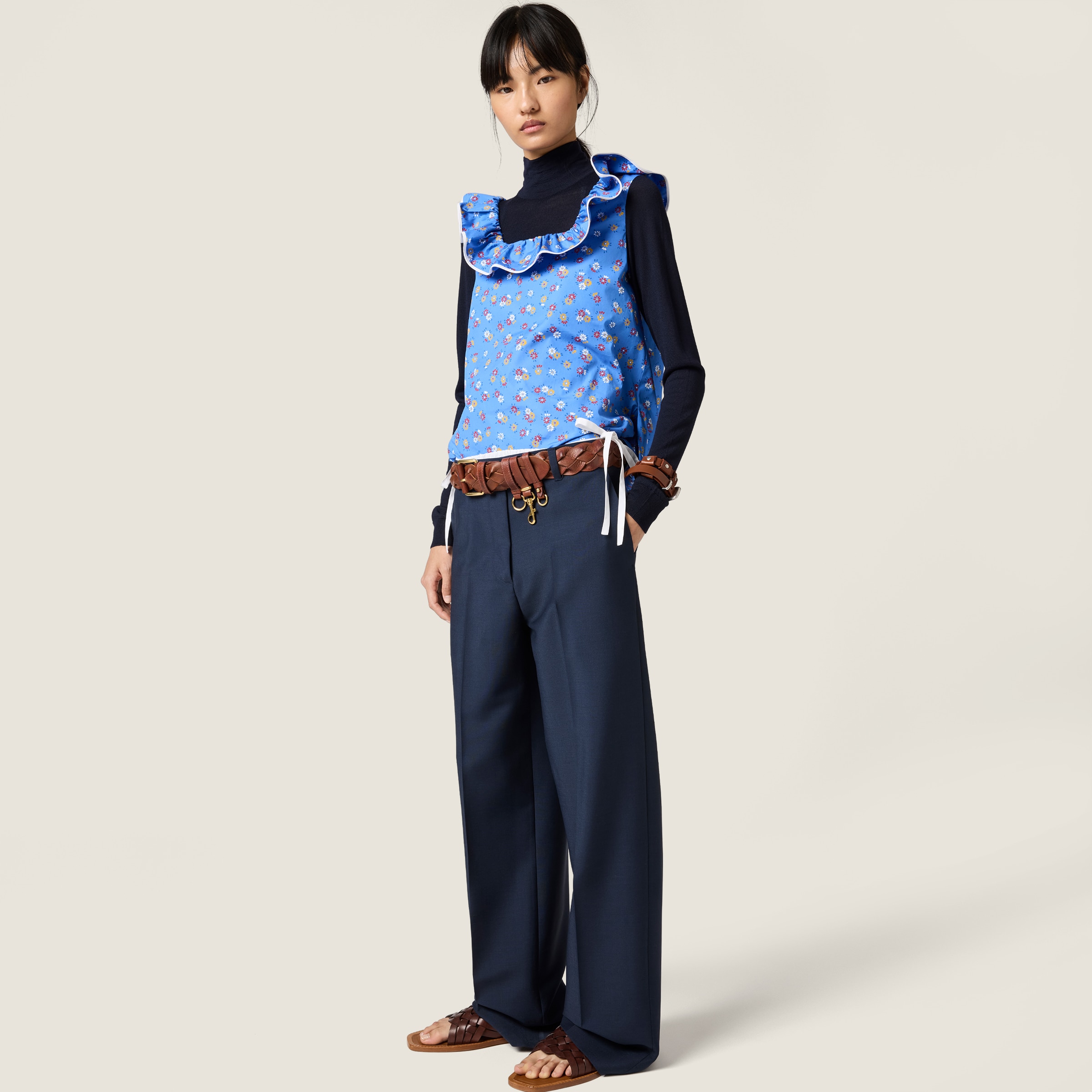Слегка свободный крой этих брюк отсылает к рабочей одежде и создает расслабленный образ, который подчеркивается классическим кид-мохером, придающим изделию легкое тепло и благородный блеск.