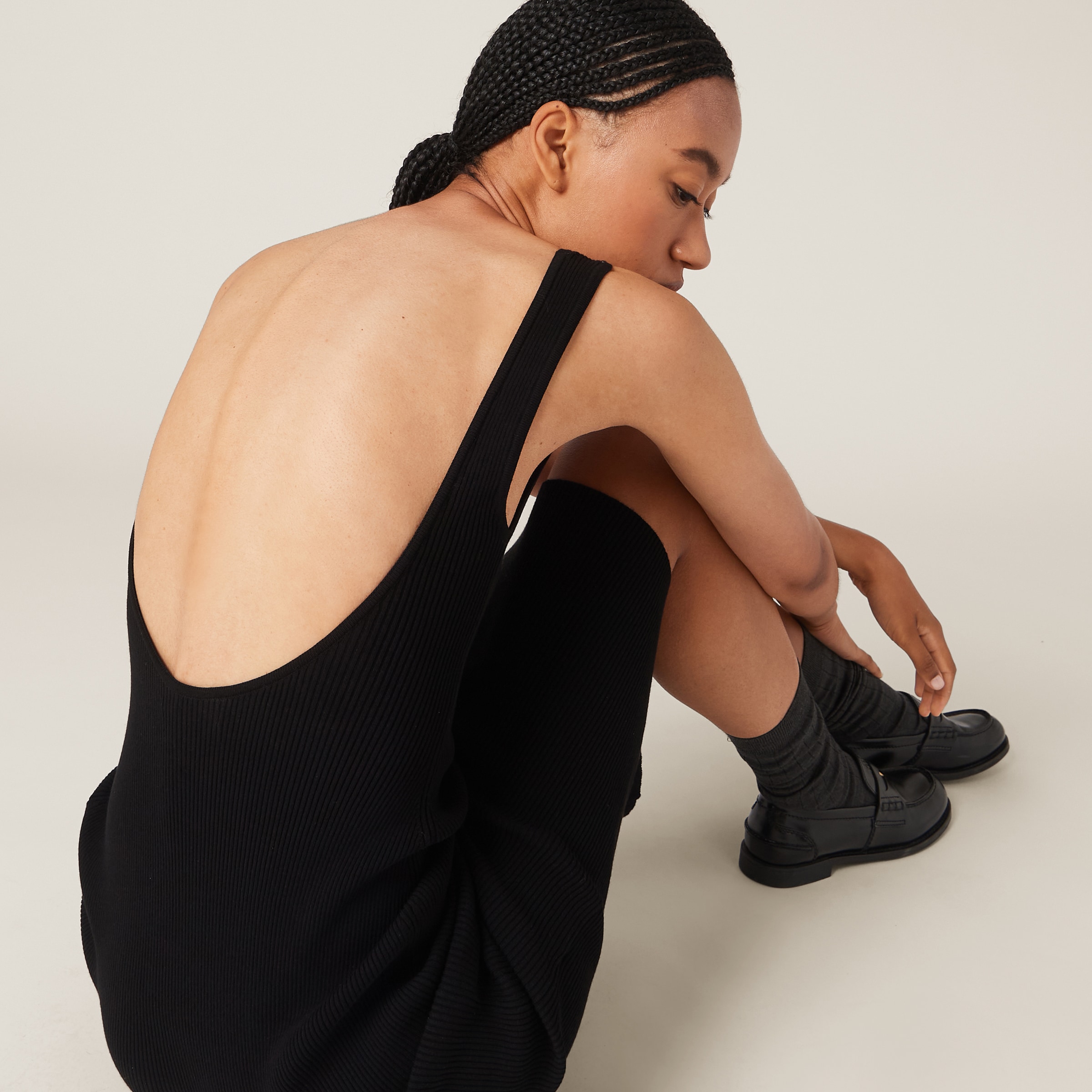 Смелый, культовый стиль Miu Miu сопровождает образ и лаконичные линии этого нового платья. Платье-футляр, обычно ассоциирующееся с формальной элегантностью, приобретает спортивное настроение благодаря ребристой вязке, покрывающей изделие, а интарсия-логотип контрастного цвета придает выразительный акцент.