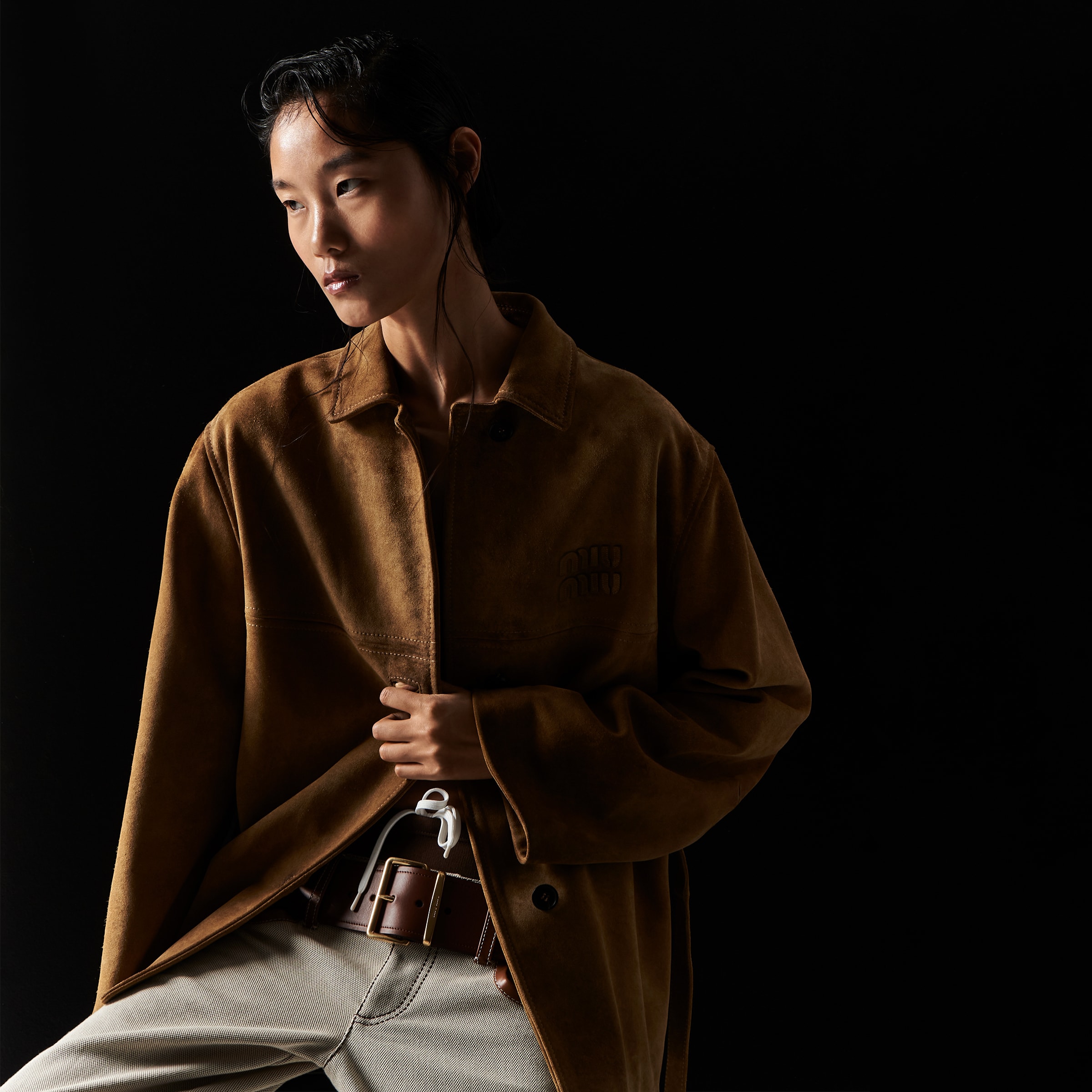 Эстетика этого кожаного жакета одновременно винтажная и современная. Пояс собирает свободный силуэт изделия, а тисненый логотип в тон завершает дизайн культовой деталью.