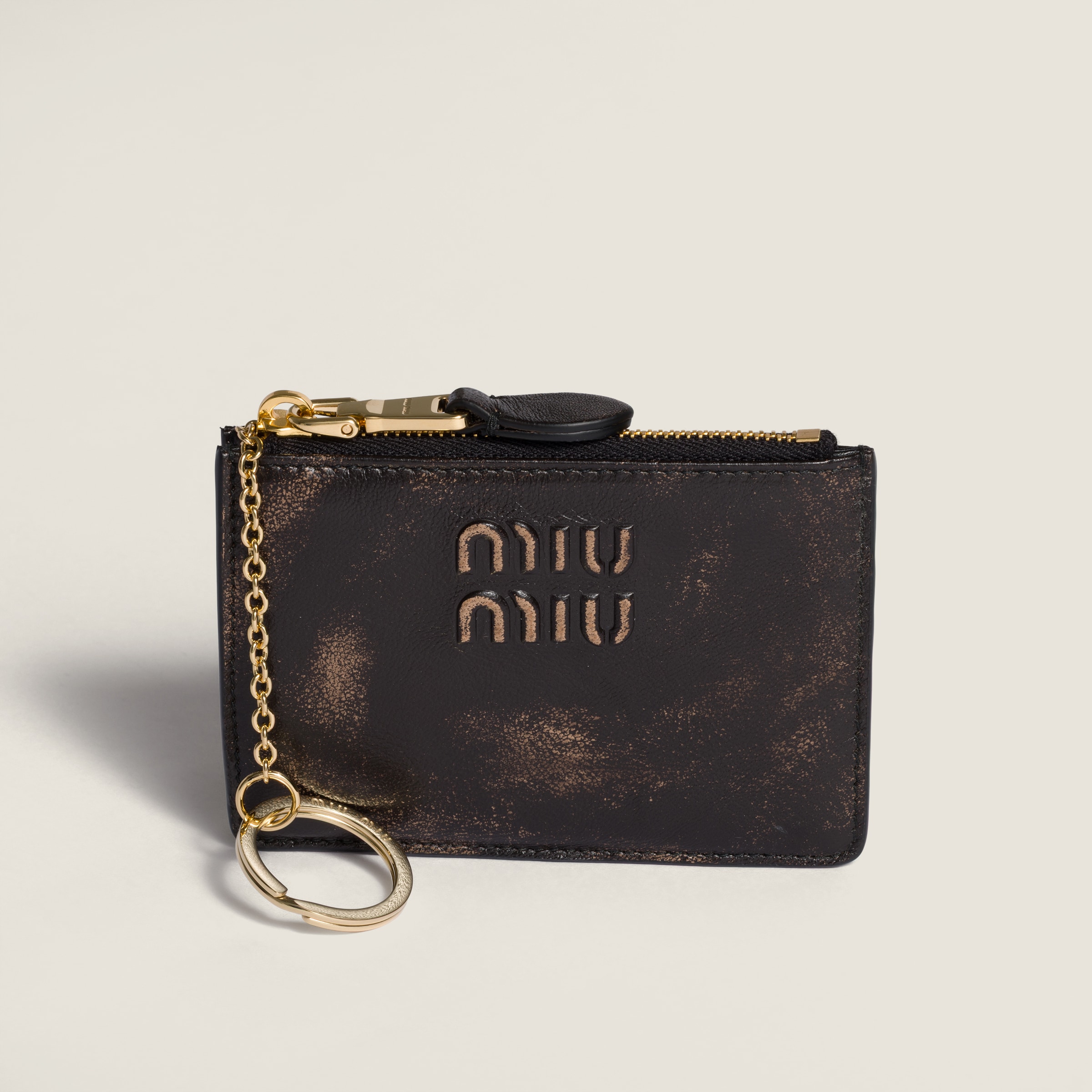 Преднамеренно состаренный эффект наппа-кожи и фирменный акцент в виде логотипа Miu Miu обогащают простые линии нового держателя для карт. Отделения для карт и кольцо для ключей дополняют дизайн функциональными деталями.