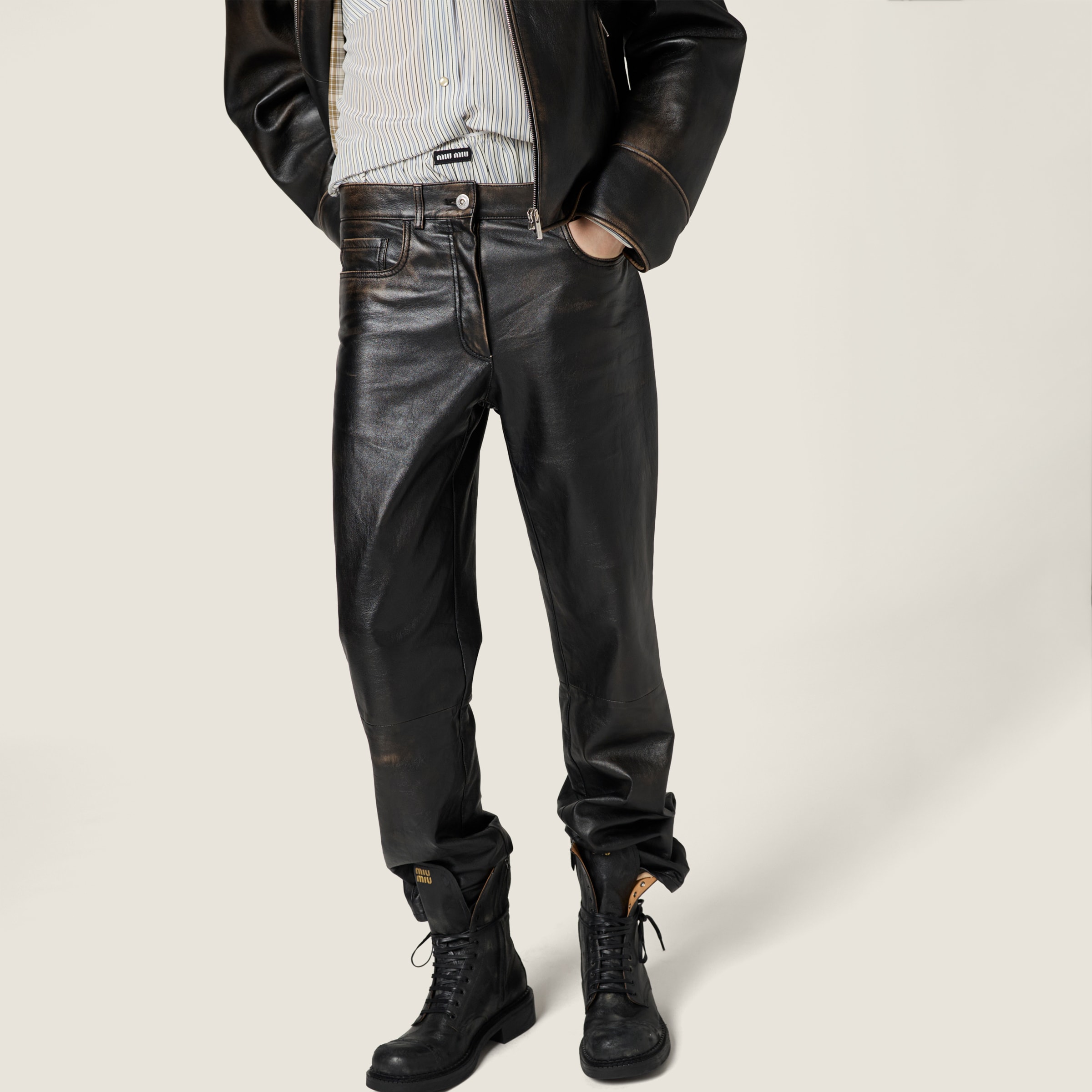 Эти брюки, вдохновленные мужским стилем, выполнены из мягкой наппы, прошедшей специальную обработку для придания эффекта старины, что подчеркивает винтажную привлекательность, насыщенный цвет и свободный крой изделия.