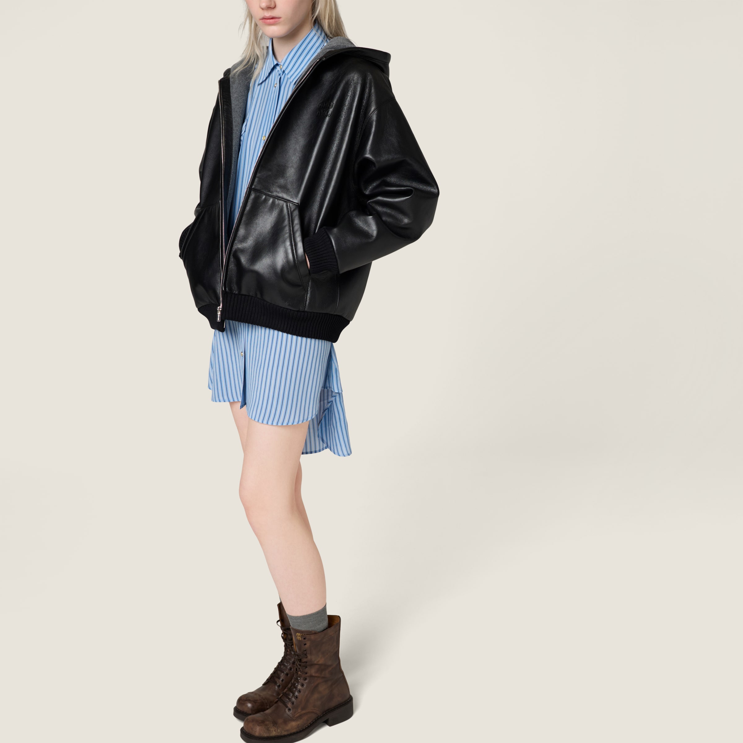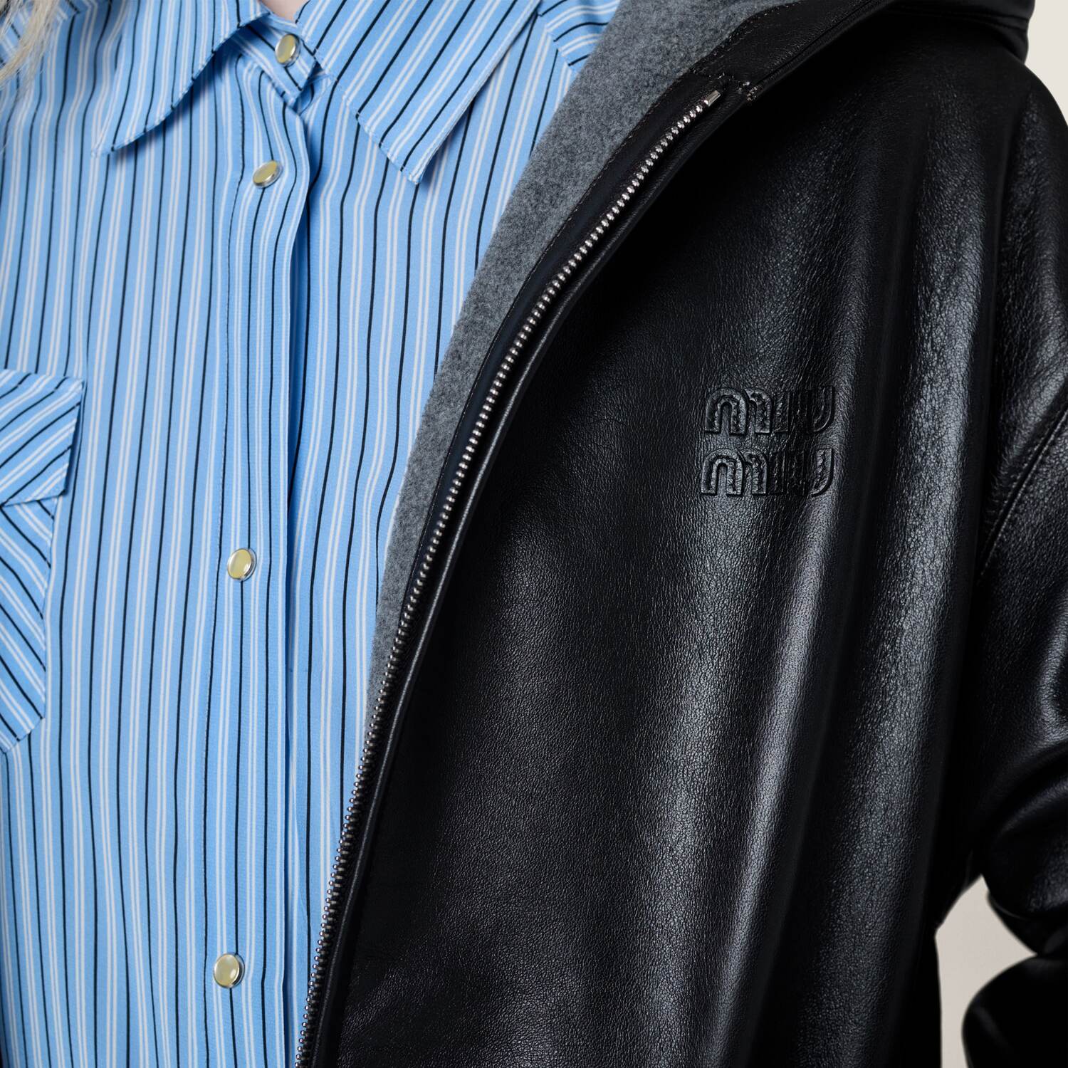 Эта куртка-блузон с капюшоном, выполненная из мягкой наппы и подбитая флисом, сочетает универсальность и структурность в элегантном силуэте. Отличительные элементы униформы Miu Miu подчеркивают ее характер, переосмысливая верхнюю одежду в современном ключе.