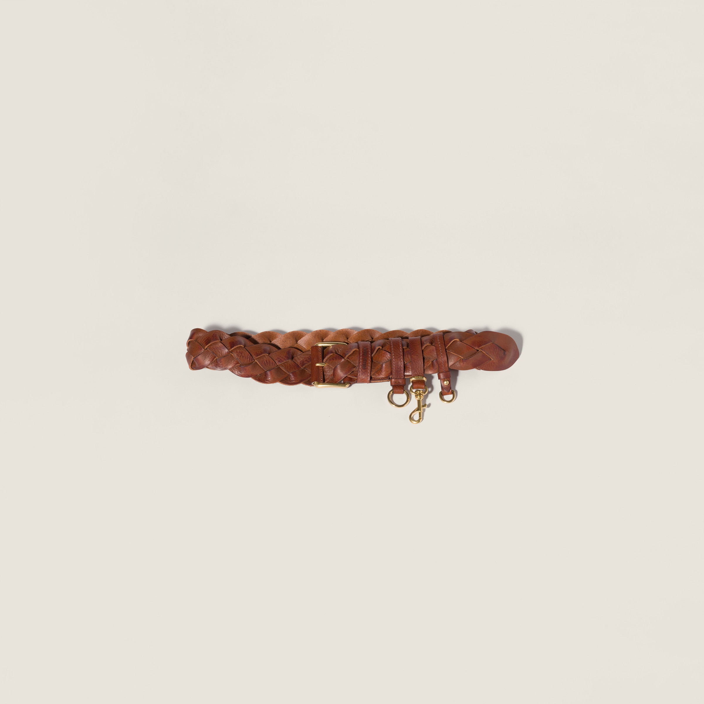 Этот элегантно сплетенный кожаный ремень с культовой пряжкой и брелоком сочетает стиль и функциональность в характерном для гардероба Miu Miu стиле.