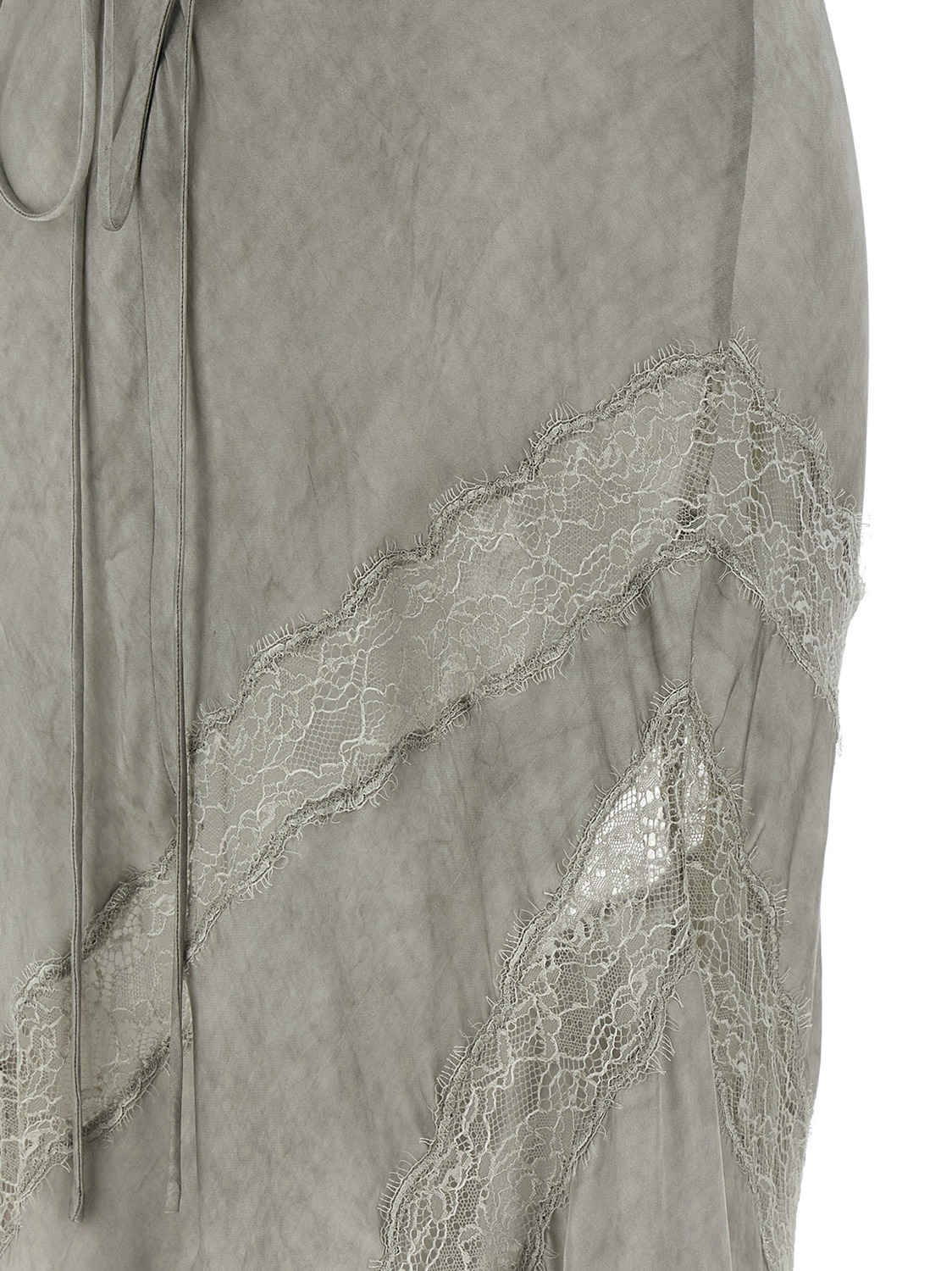 Длинное платье 'Rosetta' из холодокрашенного сатина с вставками из кружева в тон, с широким вырезом спереди и сзади, тонкими бретелями с застежкой на шнурке, которую завязывают сзади, без рукавов, с асимметричным подолом в стиле «русалка».