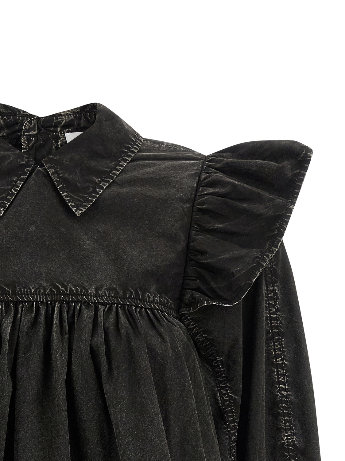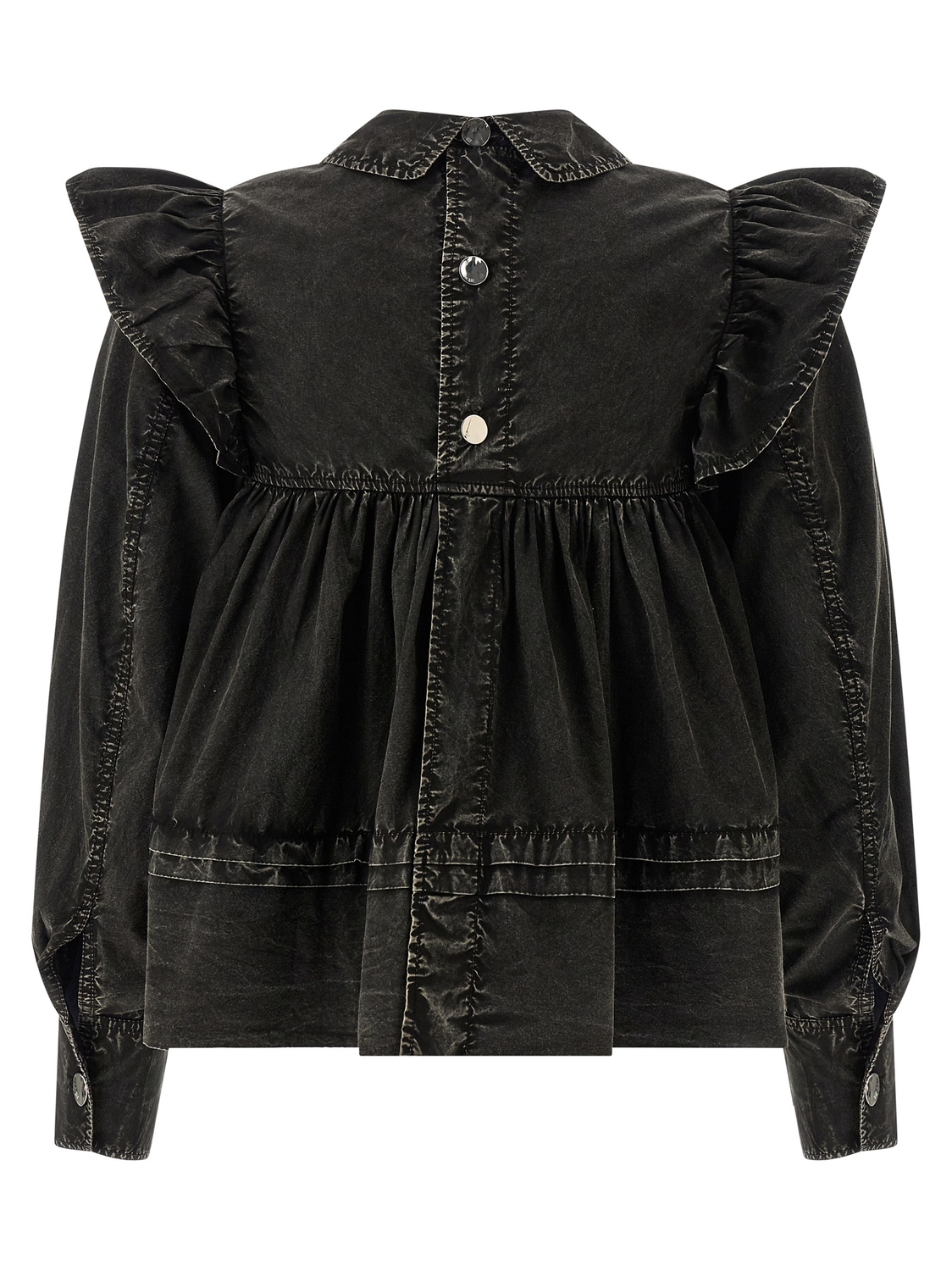 Блузка из хлопка 'Black Washed Frill', окрашенная в технике délavé, модель с присборенными деталями и мини-воланами спереди и сзади, длинные широкие рукава с манжетами и макси-оборками на плечах, застежка на пуговицы сзади.