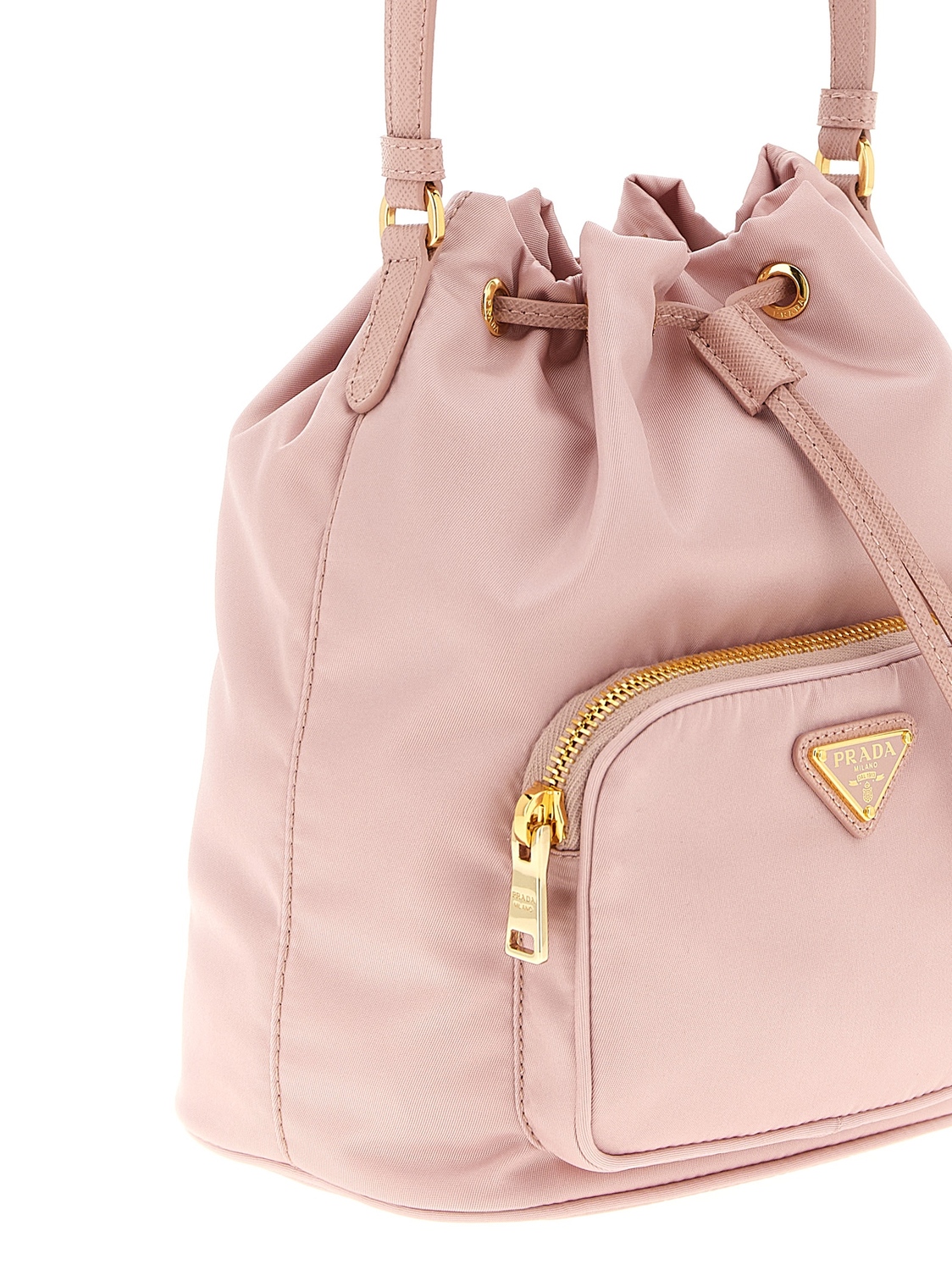Сумка-ковш 'Prada Duet' из материала Re-Nylon и кожи сафьяно в тон, с карманом на молнии и передним эмалированным металлическим логотипом-треугольником, фиксированной ручкой, застежкой на шнурке, фирменной подкладкой Re-Nylon, регулируемым и съемным плечевым ремнем. УСТОЙЧИВОЕ РЕШЕНИЕ: Этот продукт изготовлен из Re-Nylon - восстановленной пряжи, произведенной из переработанного и очищенного пластика, собранного в океанах, рыбных сетях и текстильных волокнах.