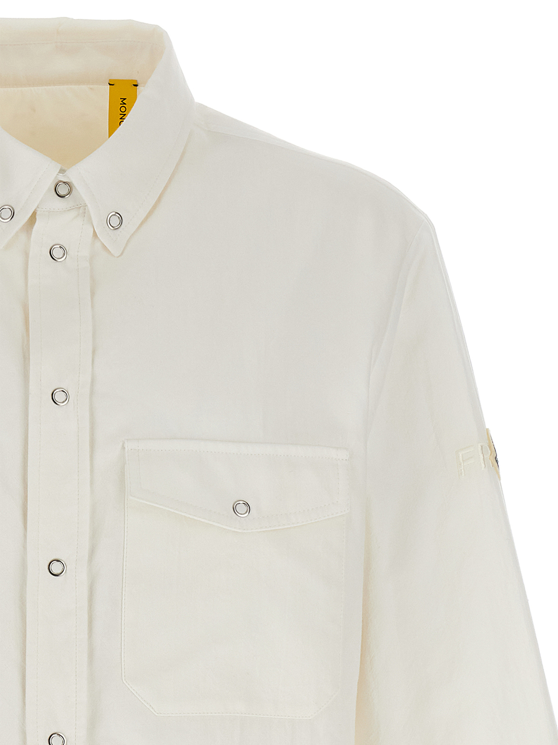 Оверсорочка Moncler x FRGMT из оксфордского хлопка, подкладка из стеганого нейлона с легкой набивкой пухом, модель на пуговицах, застежка на кнопки, нагрудный карман, длинные рукава с манжетами, тон-в-тон вышивка и нашивка-логотип из фетра.