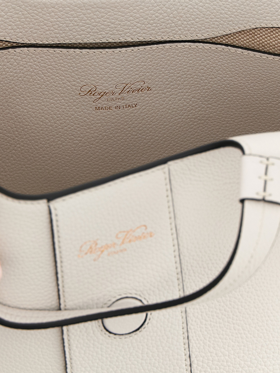Мини-шоппер из зернистой кожи, застежка на магнитной планке с металлической пряжкой 'Belle Vivier', двойная фиксированная ручка, жесткое основание с металлическими ножками, съемный плечевой ремень.
