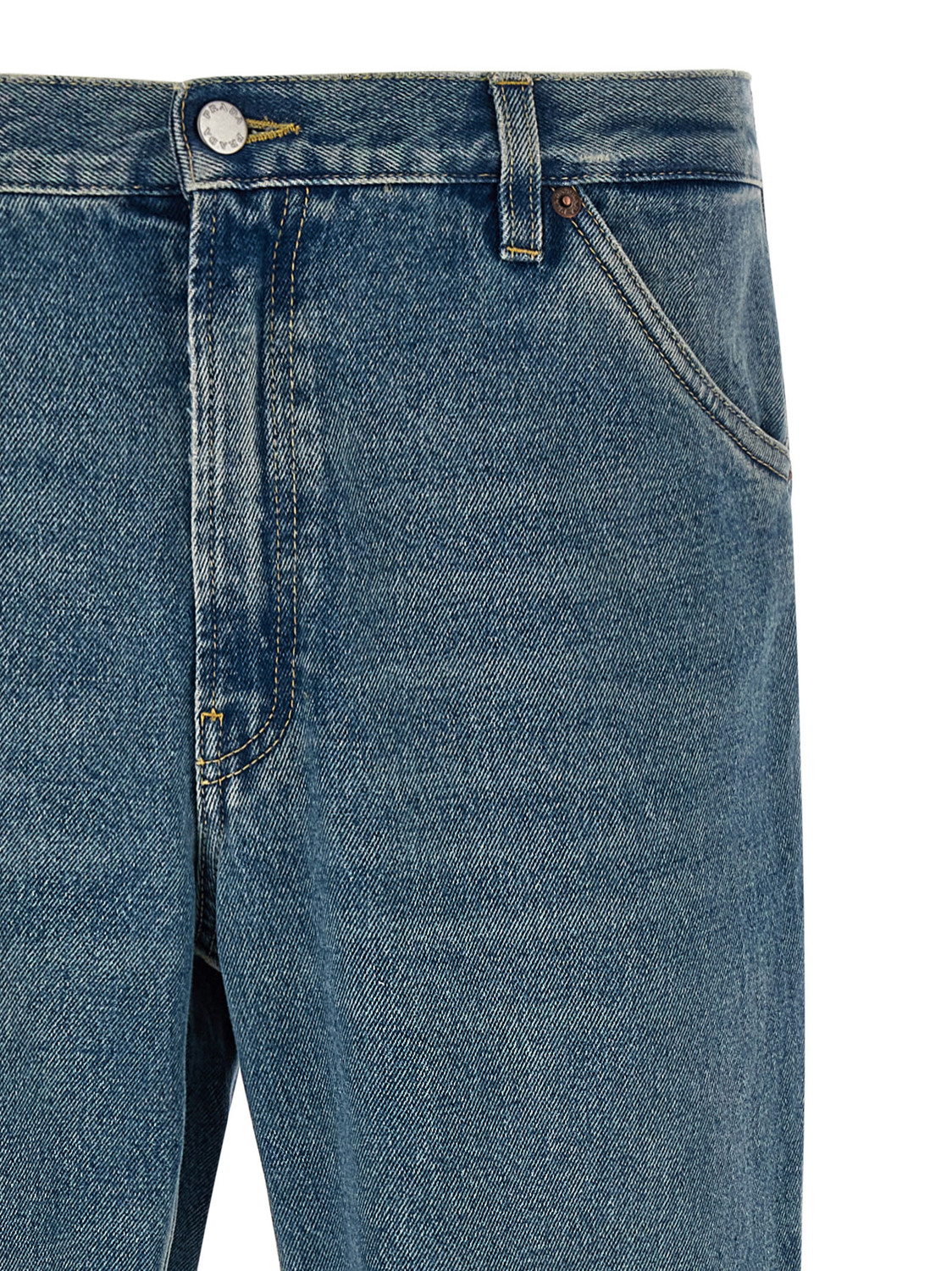 Джинсы из денима со эффектом потертости и стоунвош, контрастная строчка, средняя посадка, прямой крой, застежка на молнию и пуговицу спереди, пять карманов, задняя бирка с логотипом.