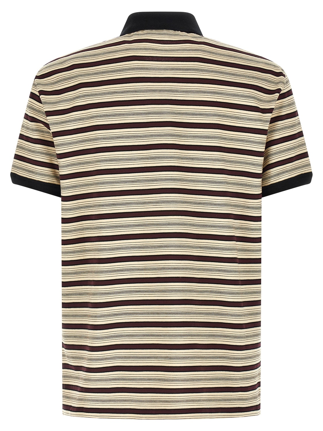 Полосатое хлопковое поло с контрастными деталями, нашивкой с логотипом и треугольным логотипом из ткани в тон на передней части, воротником и пуговицами, короткими рукавами с манжетами, боковыми разрезами и асимметричным подолом.