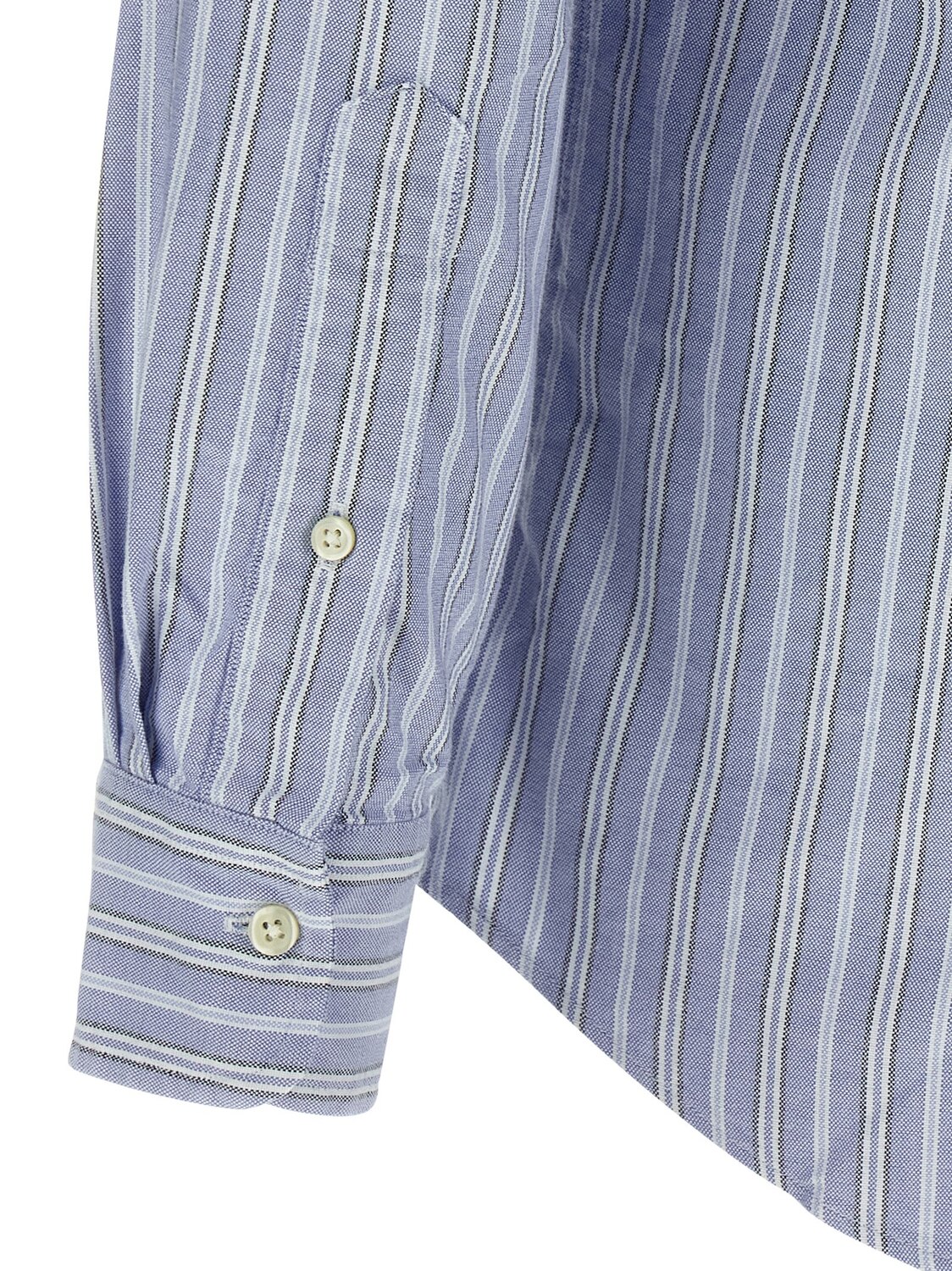 Рубашка из хлопкового оксфорда в полоску, с вышивкой логотипа, застежкой на пуговицы спереди, длинными рукавами с манжетами.