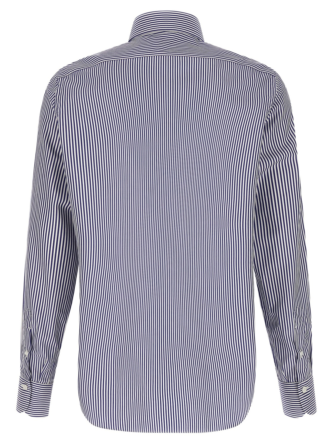 Рубашка из хлопкового поплина в полоску «Napoli» с застежкой на пуговицы спереди, длинными рукавами на манжетах, контрастной сатиновой деталью с логотипом на боковых разрезах.
