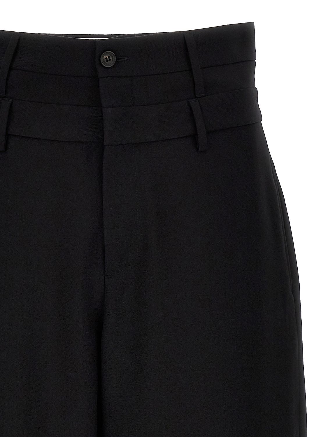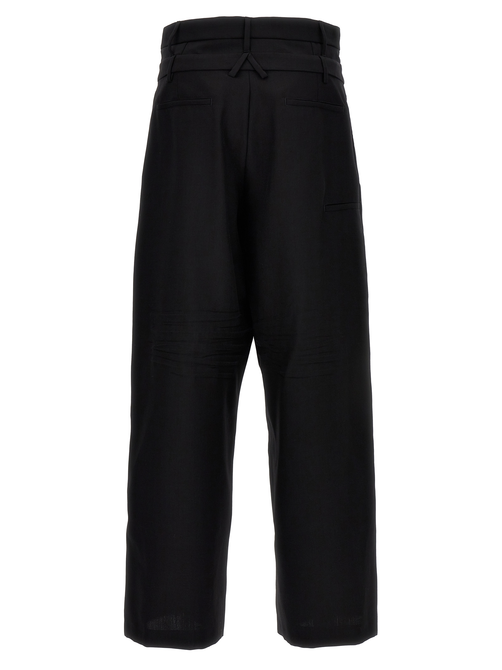 Шерстяные брюки «Double Belted» на молнии и пуговице, с карманами, широкими штанинами и эффектом смятости сзади.