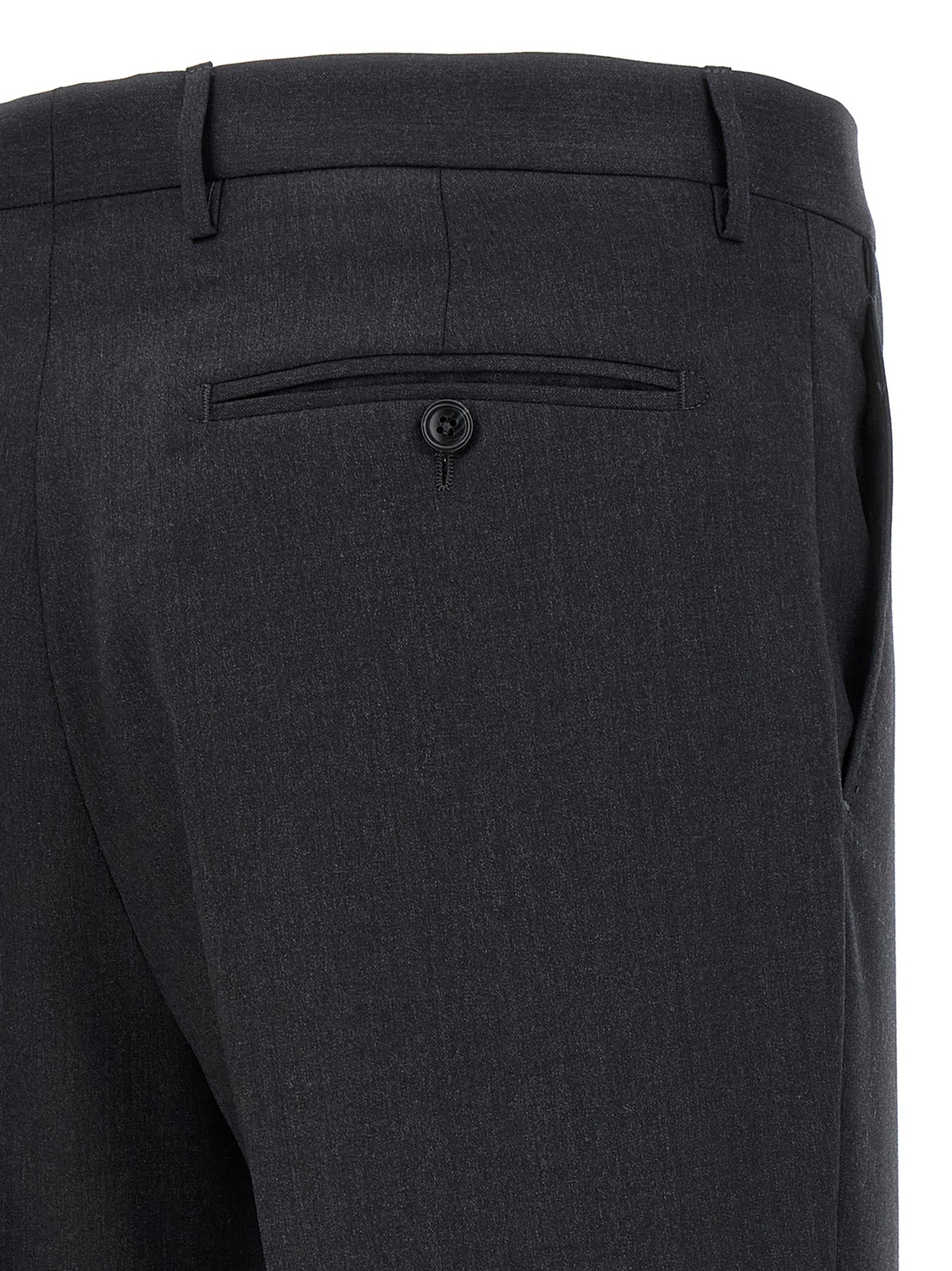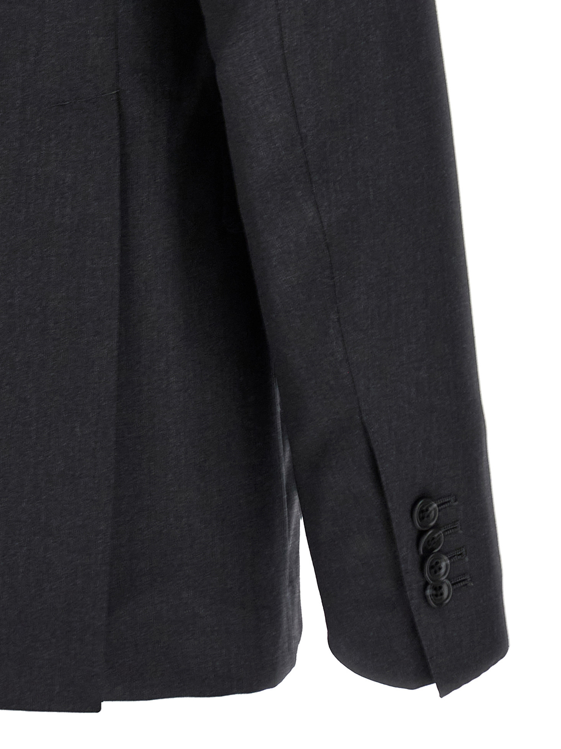 Платье Vesuvio из меланжевой шерсти вирджин, состоящее из однобортного деконструированного пиджака с застежкой на пуговицы спереди, зеркальными лацканами со съемной металлической брошью, полуподкладкой, нагрудным карманом, карманами с клапанами, манжетами с прорезями для пуговиц, разрезами сзади и обычными брюками с плоским передом, заутюженными стрелками, передними "американскими карманами", задними прорезными карманами, застежкой на молнию и пуговицы спереди.