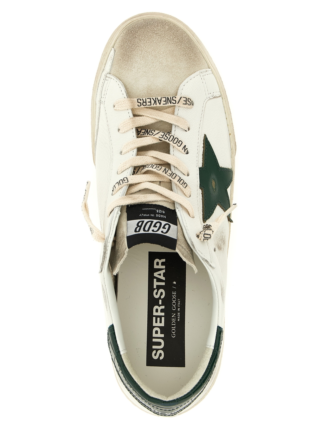 Кроссовки 'Superstar' из обработанной кожи с эффектом потертости, замшевым мысом, контрастной боковой звездой, контрастной лакированной кожаной пяткой с тиснением под крокодила, шнуровкой и резиновой подошвой.