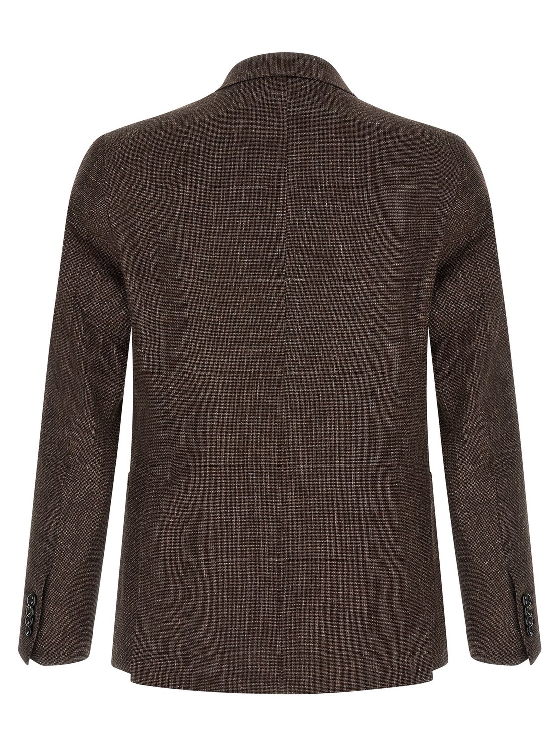 Однобортный пиджак 'Montecarlo' из льняного и хлопкового микса с застежкой на пуговицы спереди, лацканами с острыми концами и съемной металлической булавкой, нагрудным карманом, накладными карманами, без подкладки, двумя внутренними карманами, манжетами с открытыми петлями, разрезами сзади.