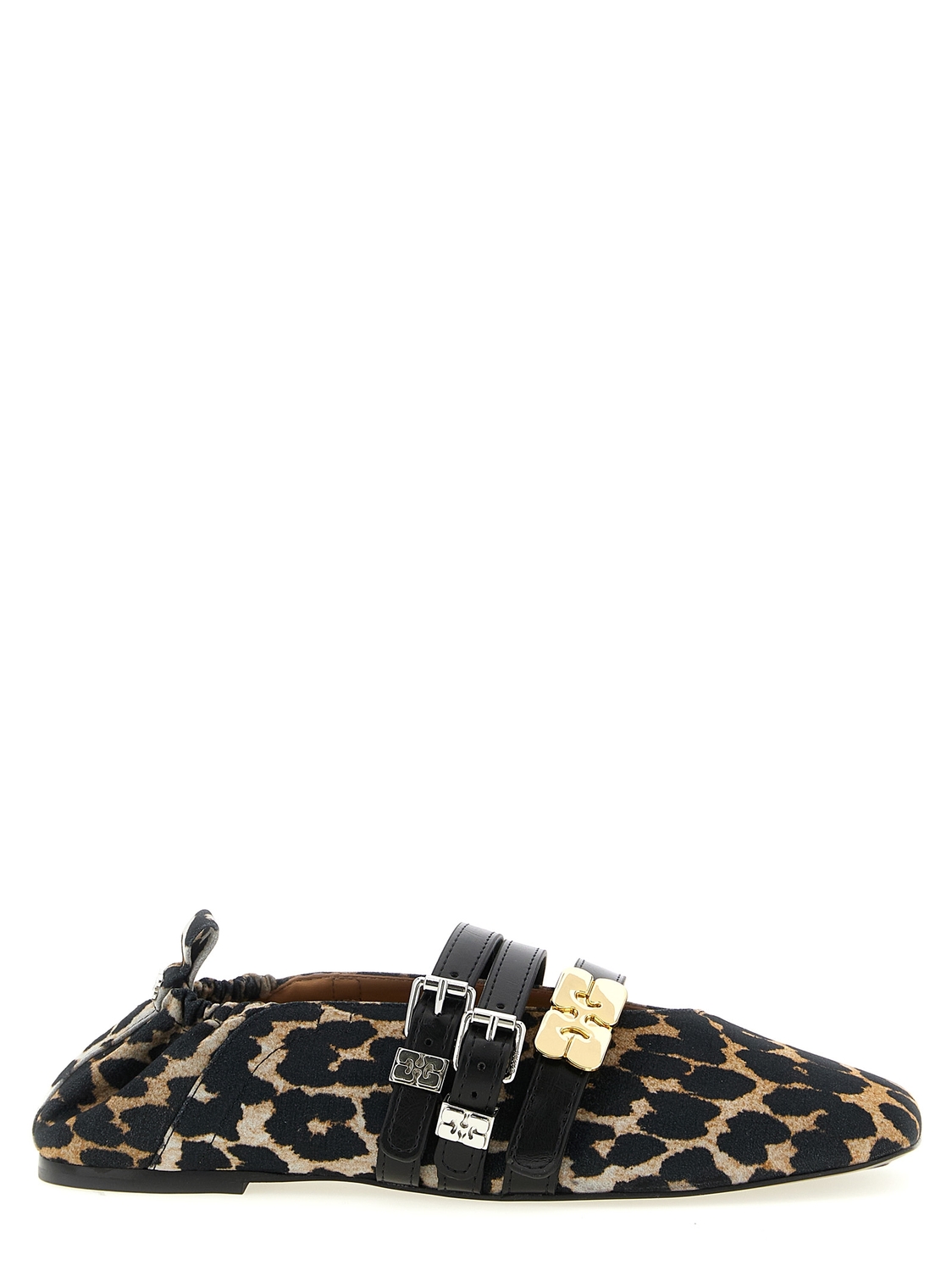 Балетки 'Sue Triple' из ткани с анималистичным принтом, регулируемые ремешки, скругленный квадратный носок, эластичная вставка сзади, кожаная подошва.