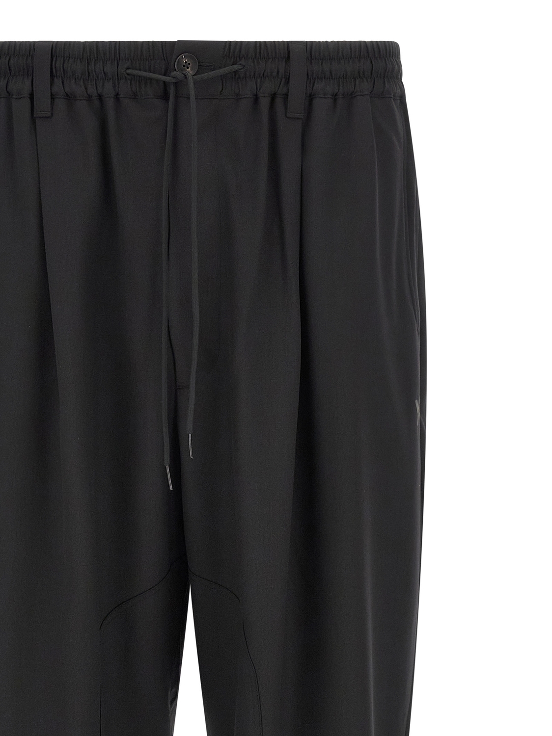 Шерстяные брюки, однотонный логотип 'Y-3' спереди, очень широкая штанина, эластичный пояс с кулиской, застежка на молнию и пуговицу спереди, карманы.