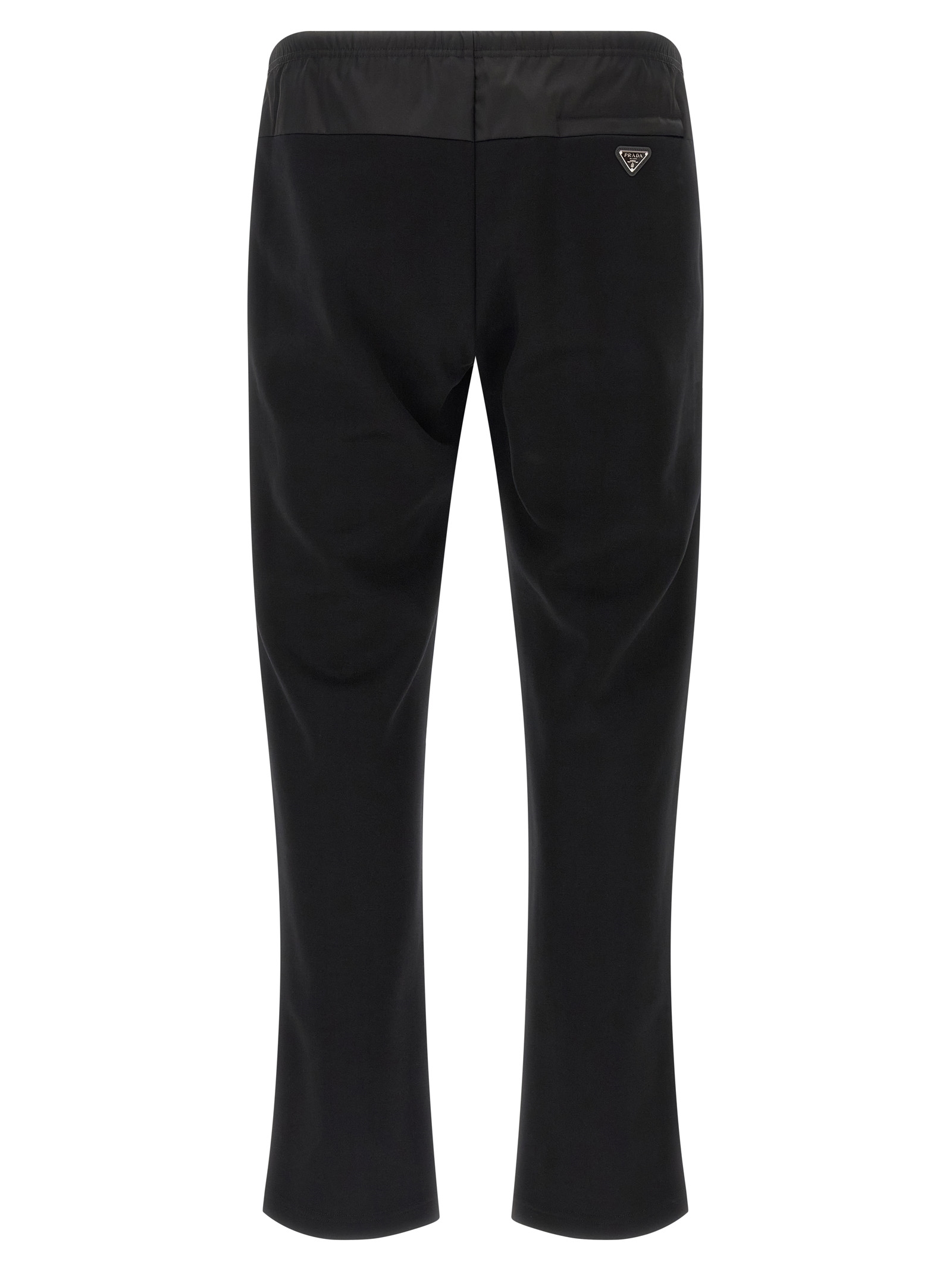 Хлопковые джоггеры с однотонными боковыми вставками из Re-Nylon, эластичным поясом на шнурке, декоративным клапаном trompe l'oeil, карманами, прямыми штанинами с центральной прострочкой и эмалированным металлическим треугольным логотипом сзади. ЭКОЛОГИЧНО: Этот продукт изготовлен из Re-Nylon - восстановленной пряжи, произведенной из переработанного и очищенного пластика, собранного в океанах, рыболовных сетях и текстильных волокнах.