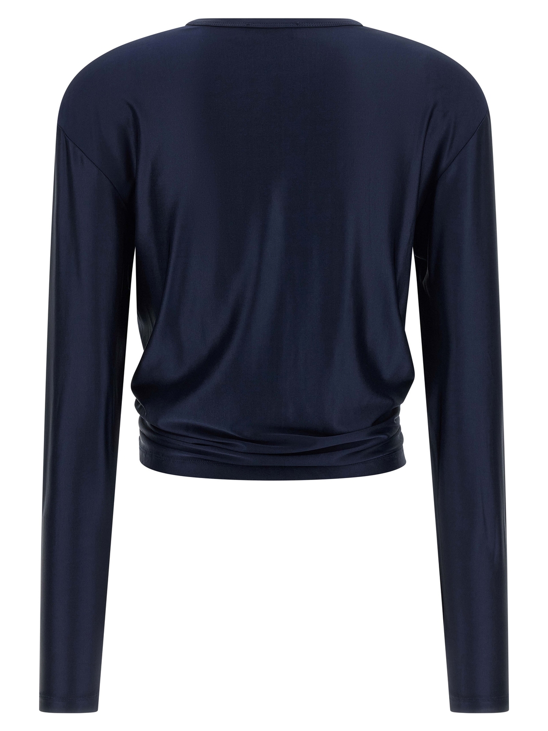 Топ из сатиновой вискозы, металлическая деталь 'Piercing Detail' с кристаллами спереди, создающими драпировку, укороченная модель, круглый вырез, длинные рукава, асимметричный подол.