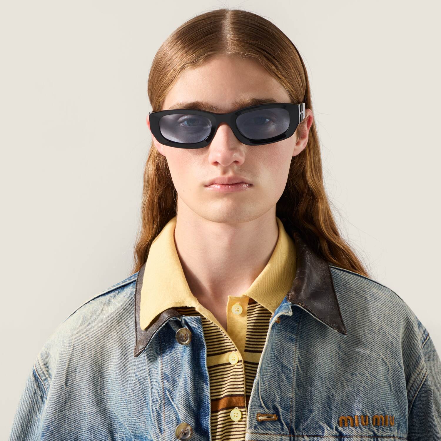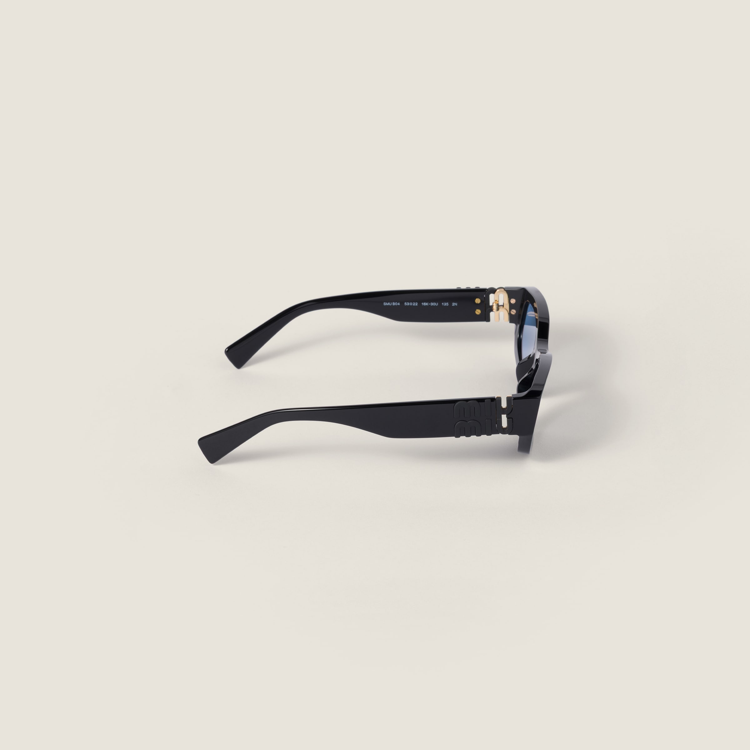 Солнцезащитные очки Miu Glimpse переосмысливают стилистические коды коллекции с помощью низко посаженных форм и обтекаемых очертаний. Прямоугольная оправа из ацетата выделяется вертикальным логотипом Miu Miu, интегрированным в петлю широких заушников.