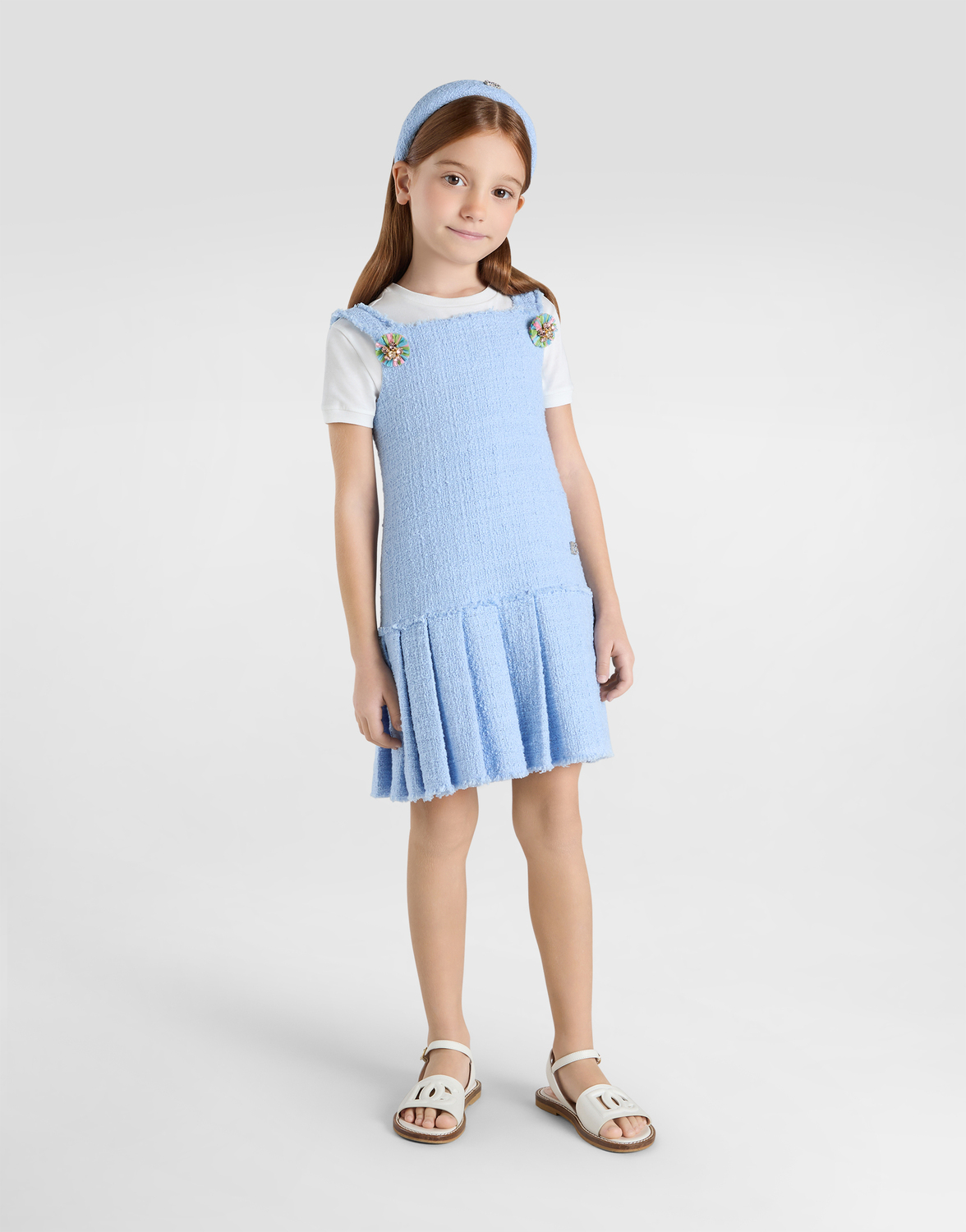 Дань элегантности и свободе самовыражения - Коллекция Farfalle для девочек отличается тематическими принтами, полосками и воздушными цветами. В ней представлены как повседневно-шикарные варианты из денима и трикотажа крючком, так и утонченные образы. Логотип Dolce&Gabbana, выполненный в виде мазков краски, придает изделиям знаковый и выразительный характер.
