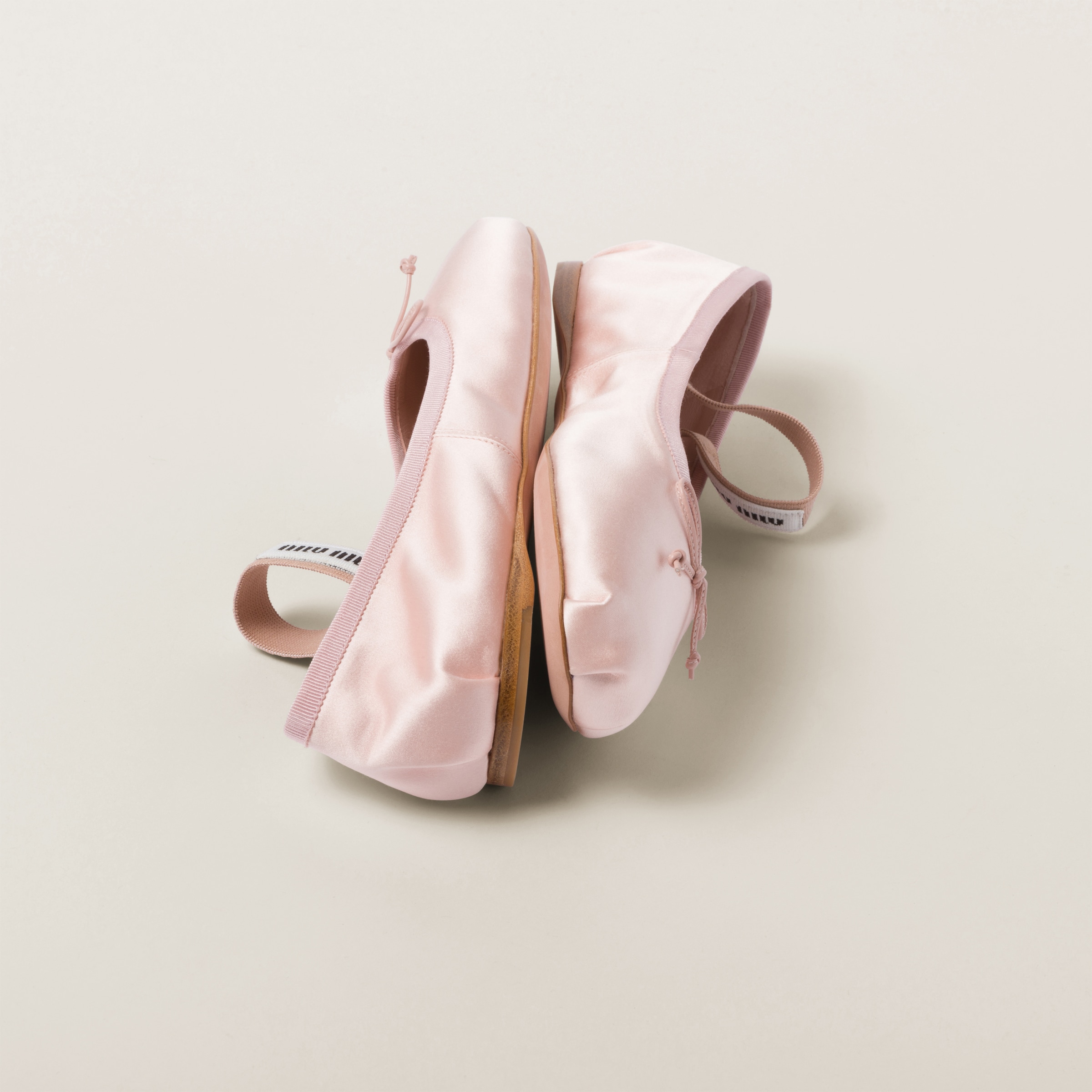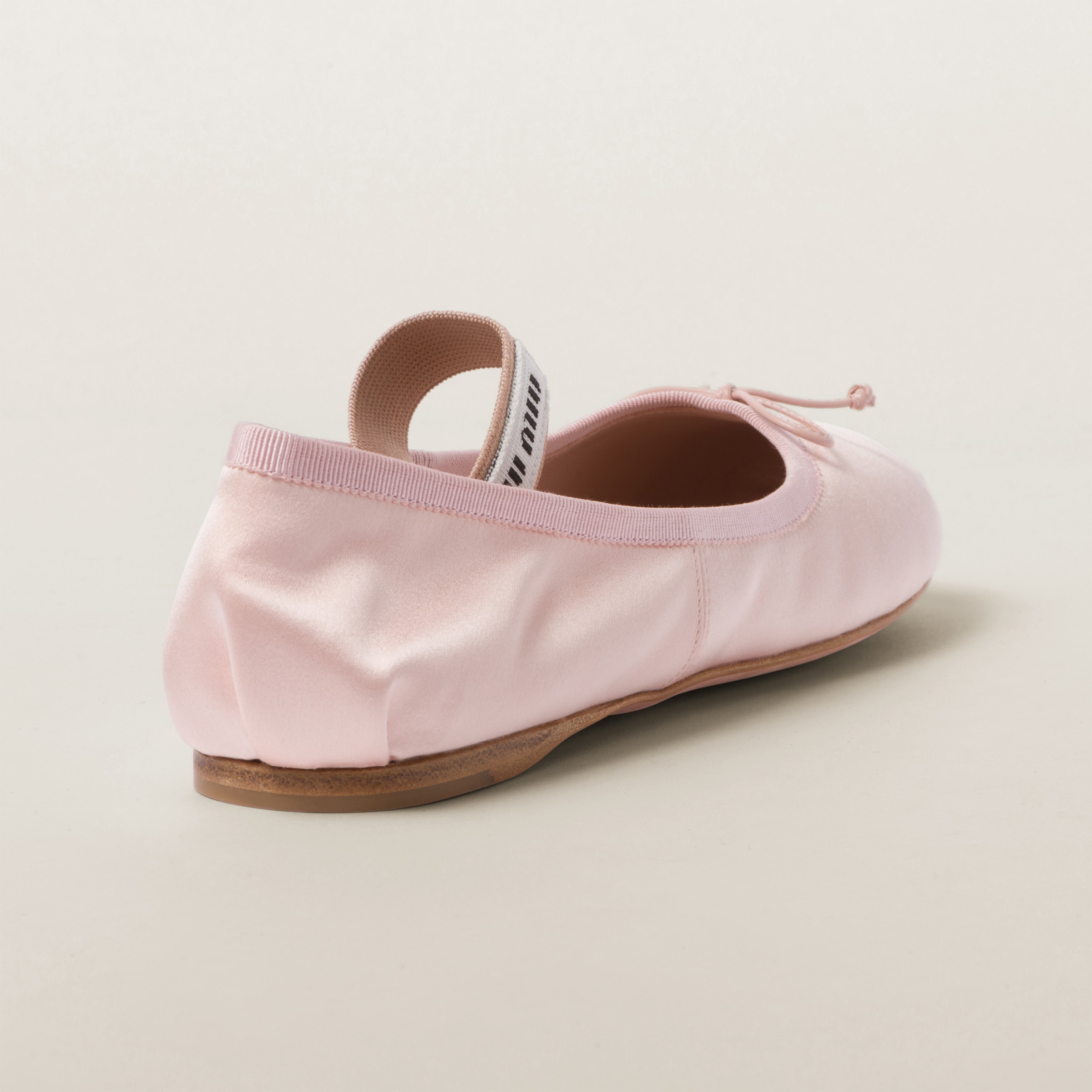 Эти балетки, ставшие культовым и узнаваемым стилем коллекций Miu Miu, представленных на показе осень-зима 2022, выполнены из сатина и украшены очень женственными деталями, такими как бант и эластичная лента с логотипом.