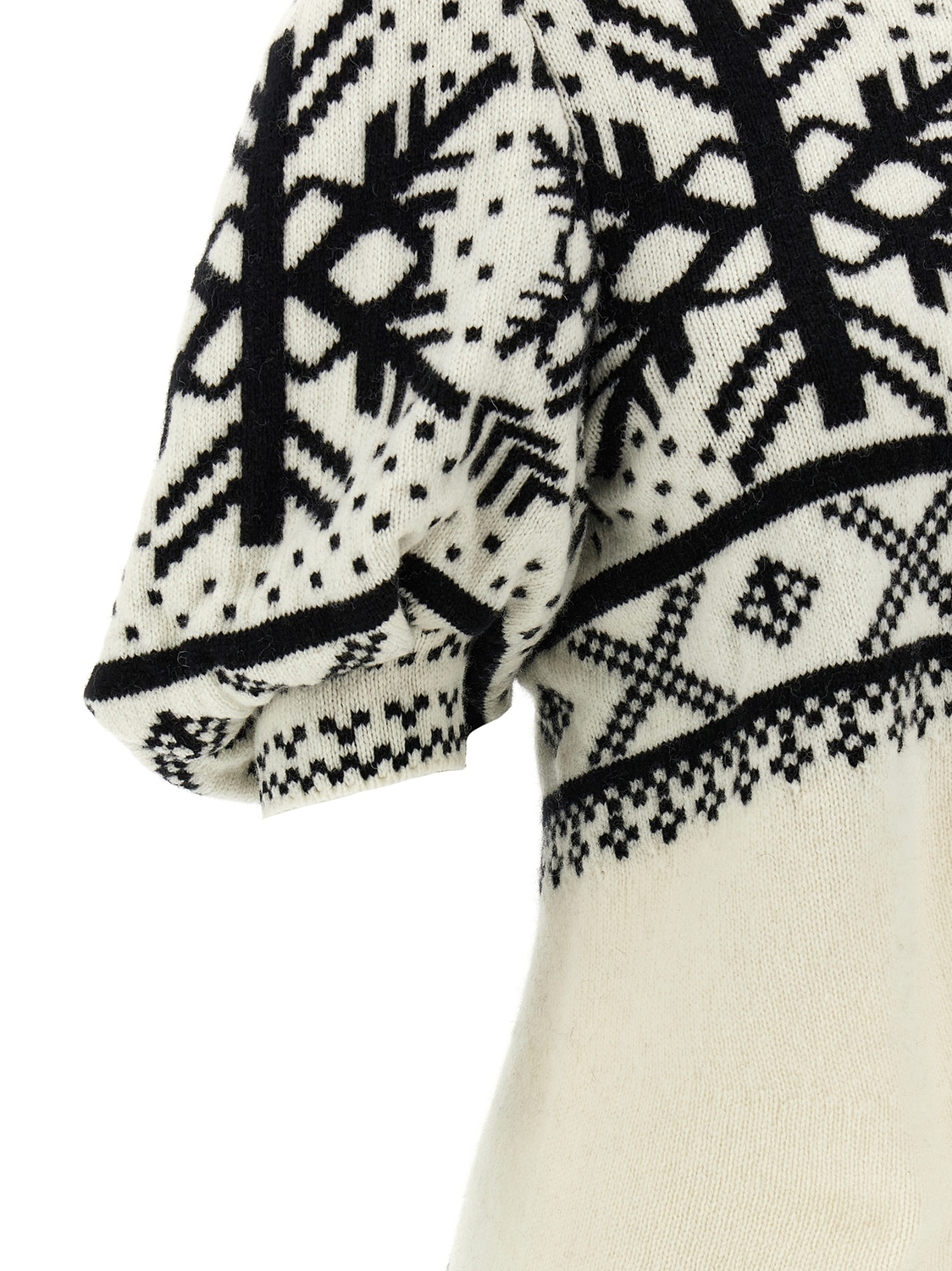 Джемпер из смесовой шерсти с жаккардовым узором, круглый вырез, короткие пышные рукава с манжетами, асимметричный подол.
