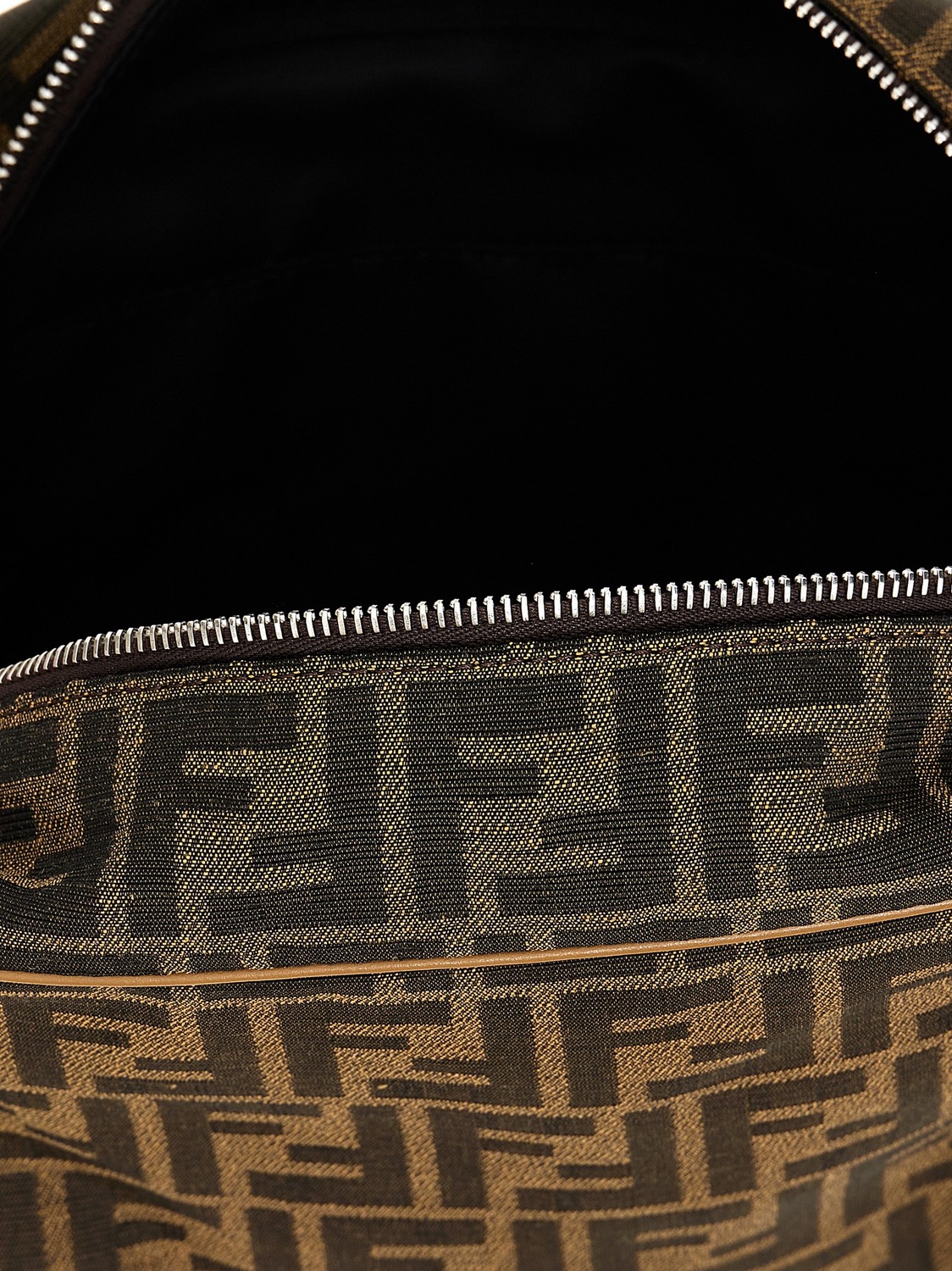 Плетеная косметичка «FF» с узором из логотипов по всей поверхности, кожаными деталями, ручкой и застежкой-молнией.