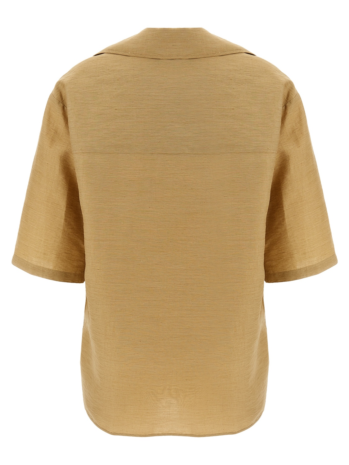 Поло «Osiride» прямого кроя с воротником, V-образным вырезом, накладным кожаным карманом с тисненным логотипом, короткими рукавами со спущенной линией плеч, асимметричным подолом и боковыми разрезами.