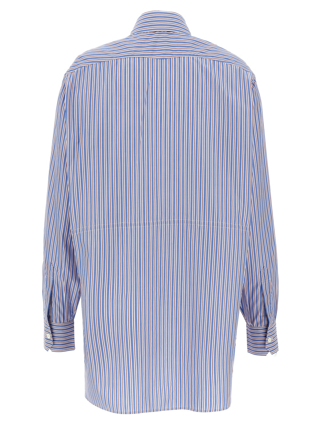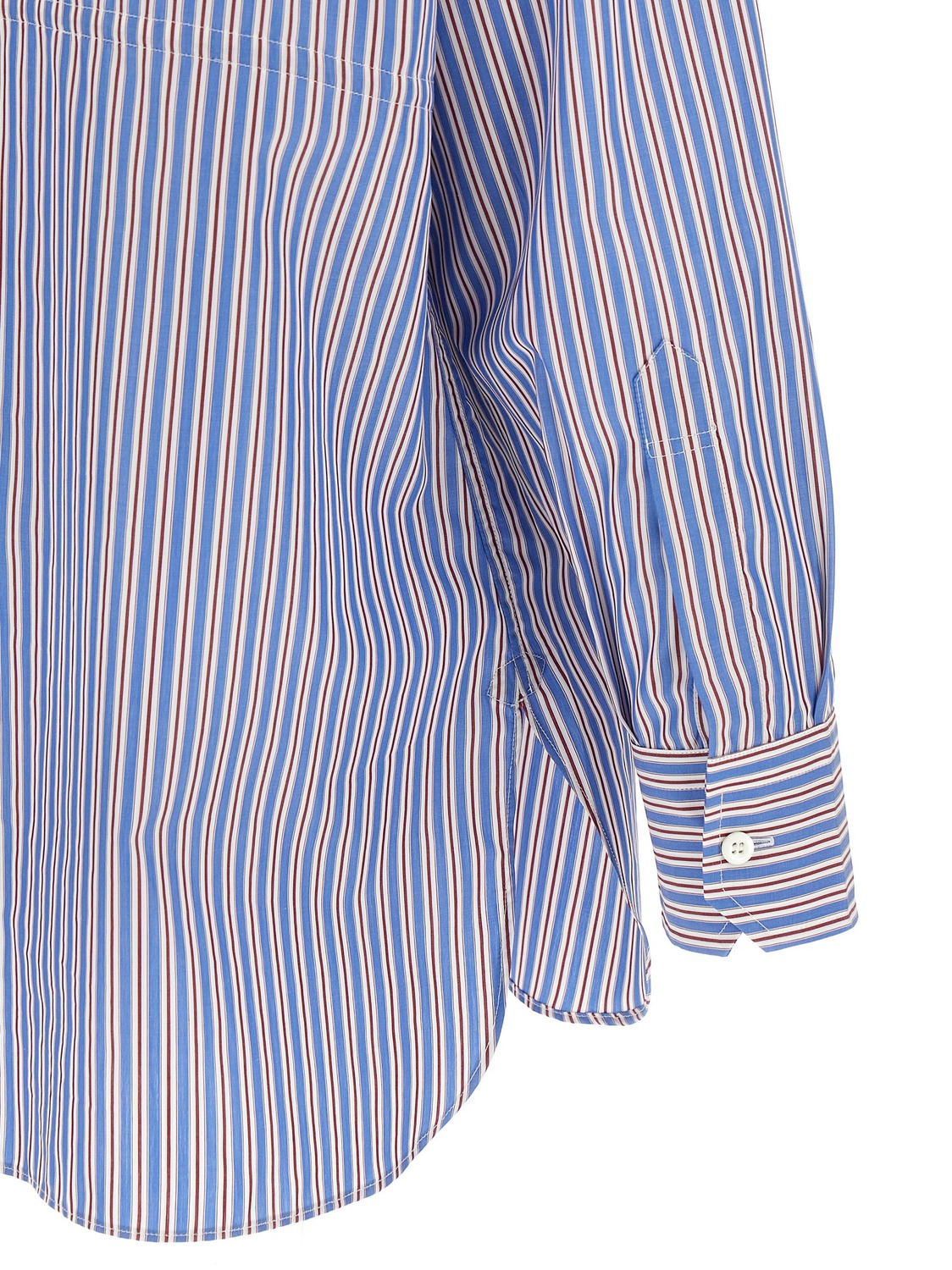 Рубашка из хлопкового поплина в полоску, треугольный логотип из однотонной ткани спереди, регулируемый шнурок на талии, застежка на пуговицы, длинные рукава с манжетами, боковые разрезы.