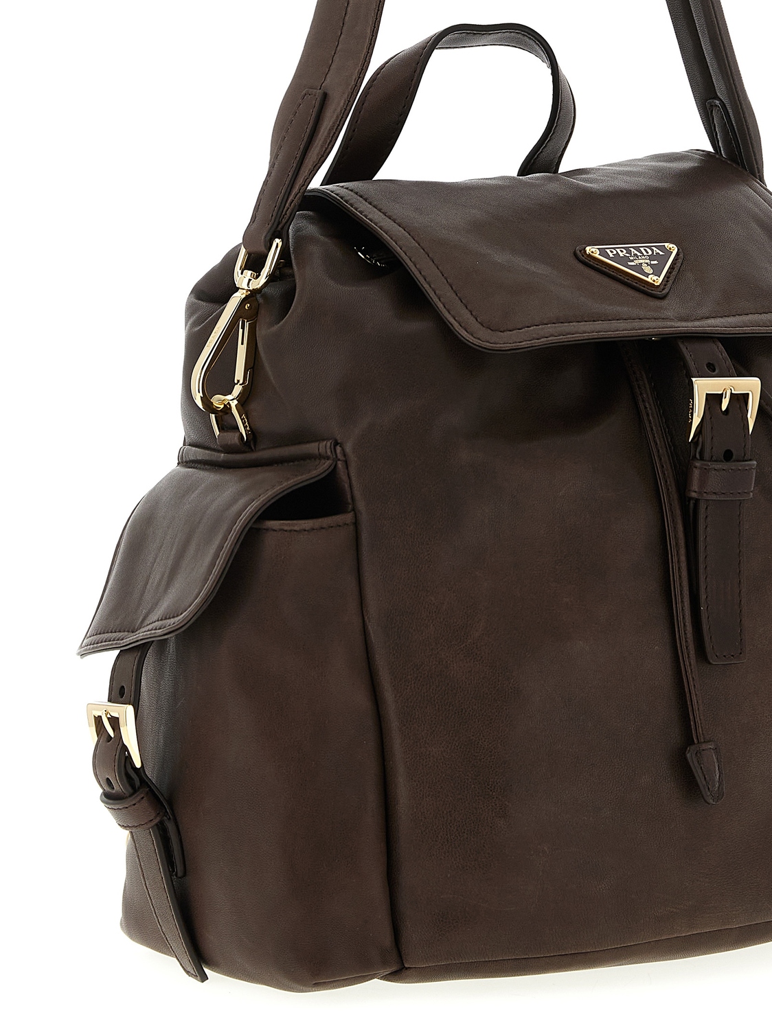 Средний рюкзак «Prada Explore» из наппы, многокарманный силуэт, фронтальный эмалированный металлический логотип-треугольник, магнитный клапан с регулируемым ремнем, фиксированная короткая ручка, съемная длинная ручка, регулируемые и съемные плечевые ремни с фирменной лентой, внутренняя стяжка на шнурке.