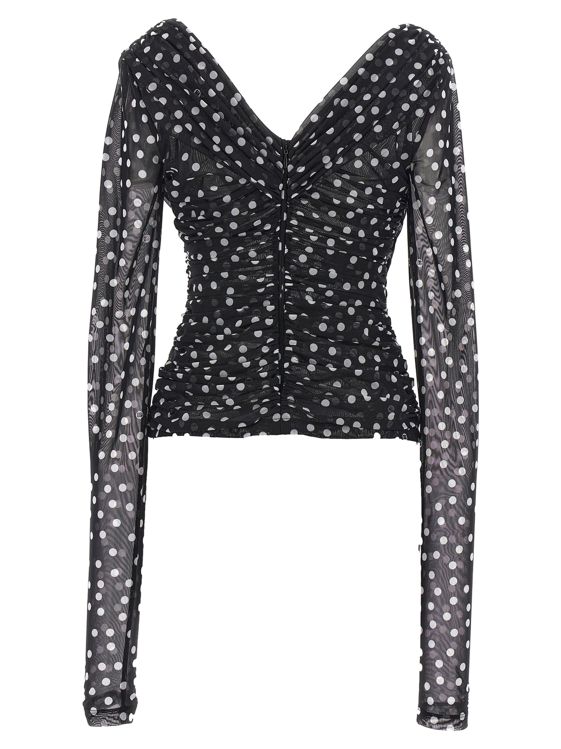 Топ из стрейчевой тюли с принтом в горошек 'Mambo', перекрещенный V-образный вырез, длинные рукава, застежка-молния на спине.